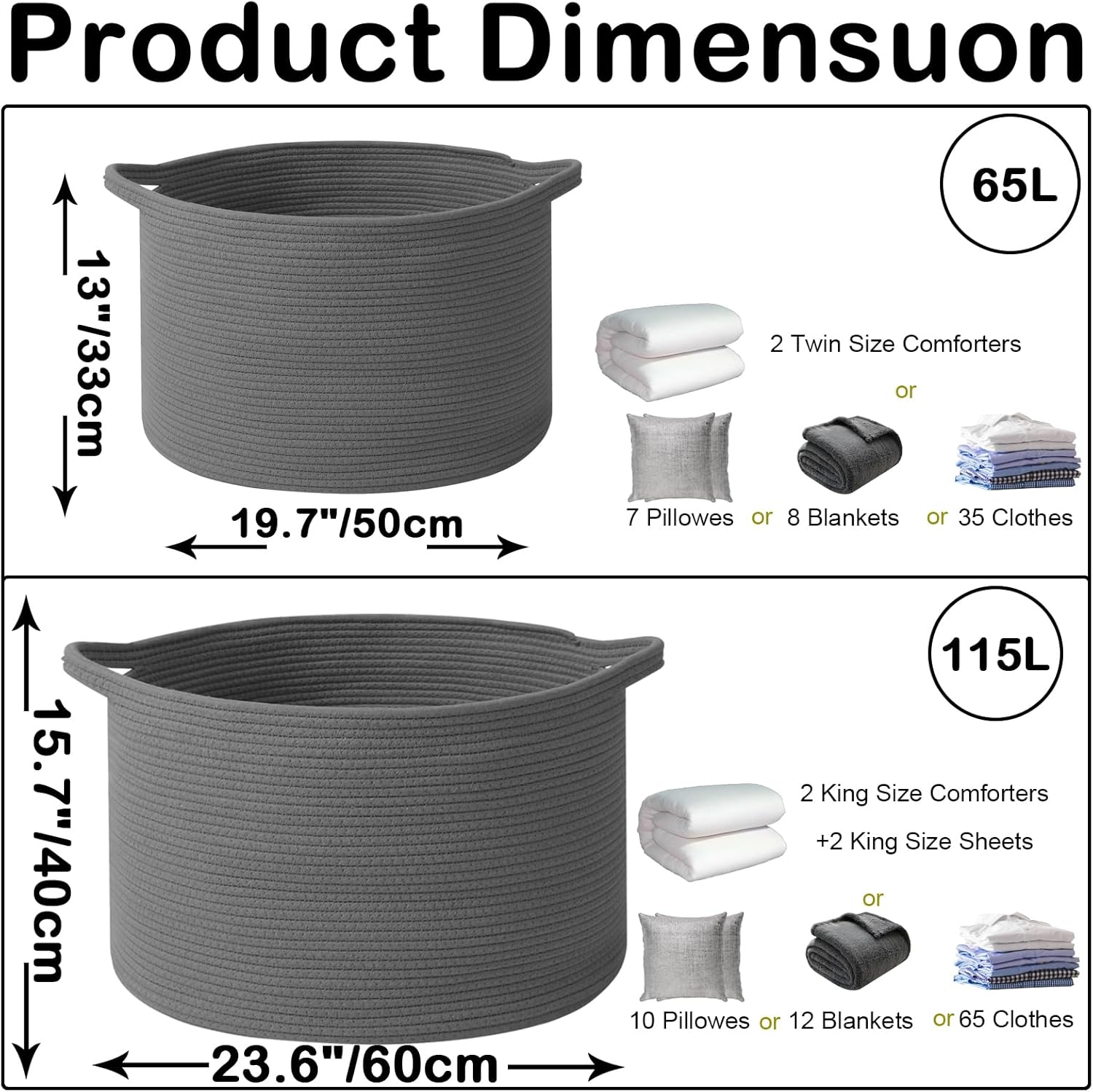 Large Blanket Basket for Organizing,115L Closet Organizers and Storage Bins Box for Shelves Woven Rope Storage Baskets,Living Room,Bedroom,Dorm,Laundry room (Dark Grey)