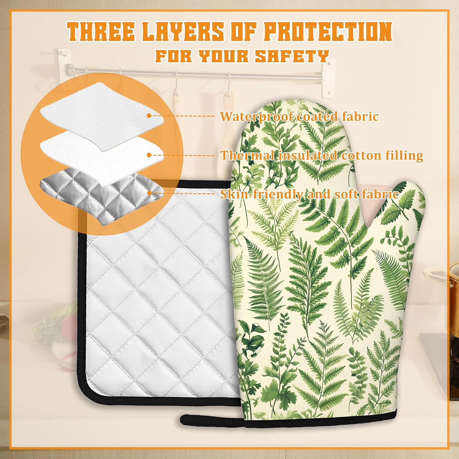 Fern Herbs Oven Mitts and Pot Holders Set,Botanical Floral Leaf Kitchen Decor Heat Resistant Non Slip Hot Pads and Oven Mitt for Chef Cooking Baking BBQ Mom Girl Gifts(4 Piece Set)