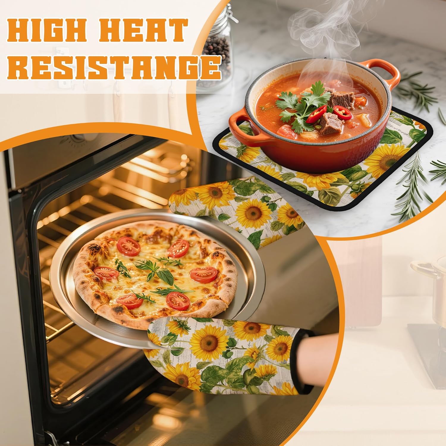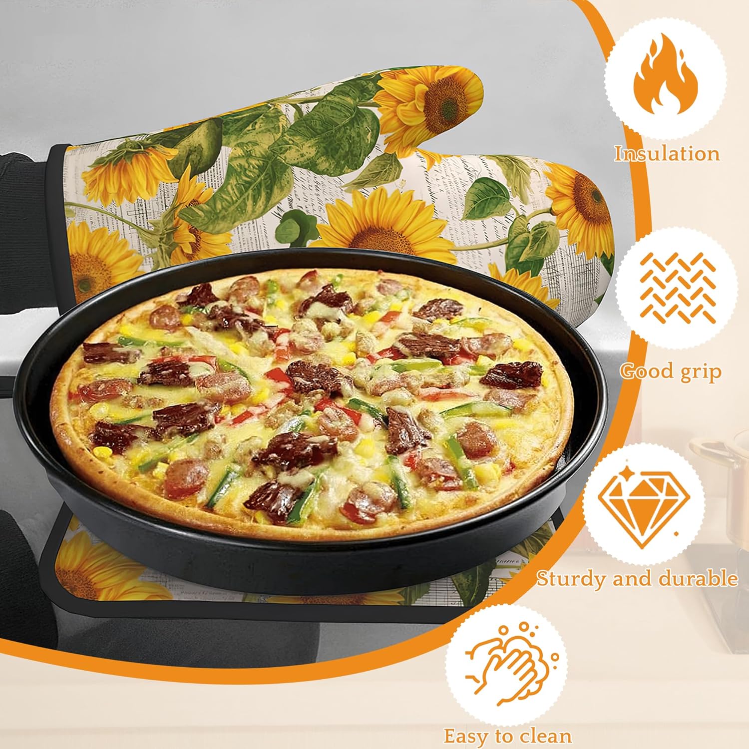 Vintage Sunflower Oven Mitts and Pot Holders,Heat Resistant Oven Mitts Gloves and Pot Holder for Home Kitchen Decorations Cooking Baking BBQ Gifts,Set of 4