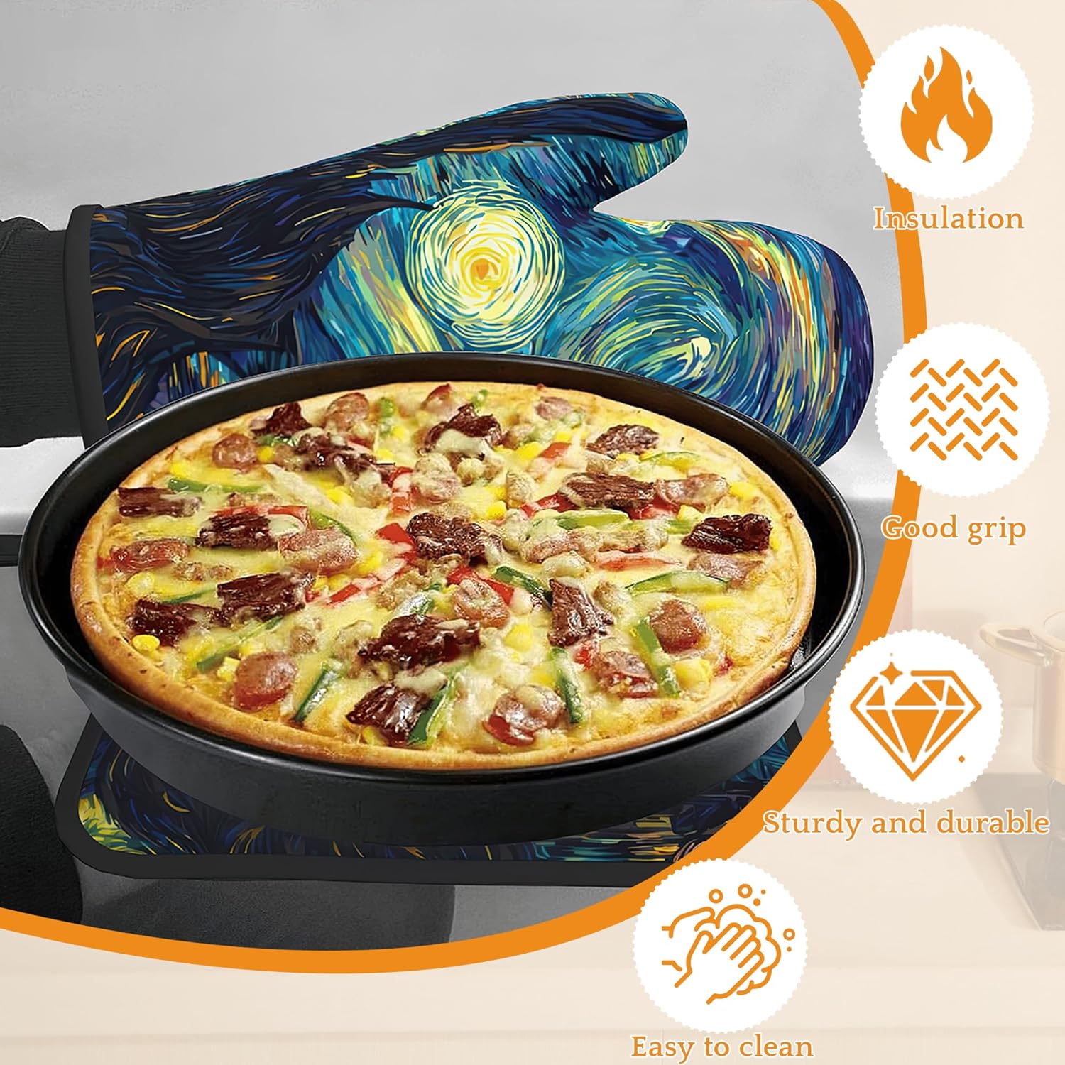 Starry Night Moon Oven Mitts and Pot Holders Set,Village Kitchen Oven Gloves and Pot Holder with Heat Resistant Non Slip for Cooking Baking Grilling(4 Piece Set)