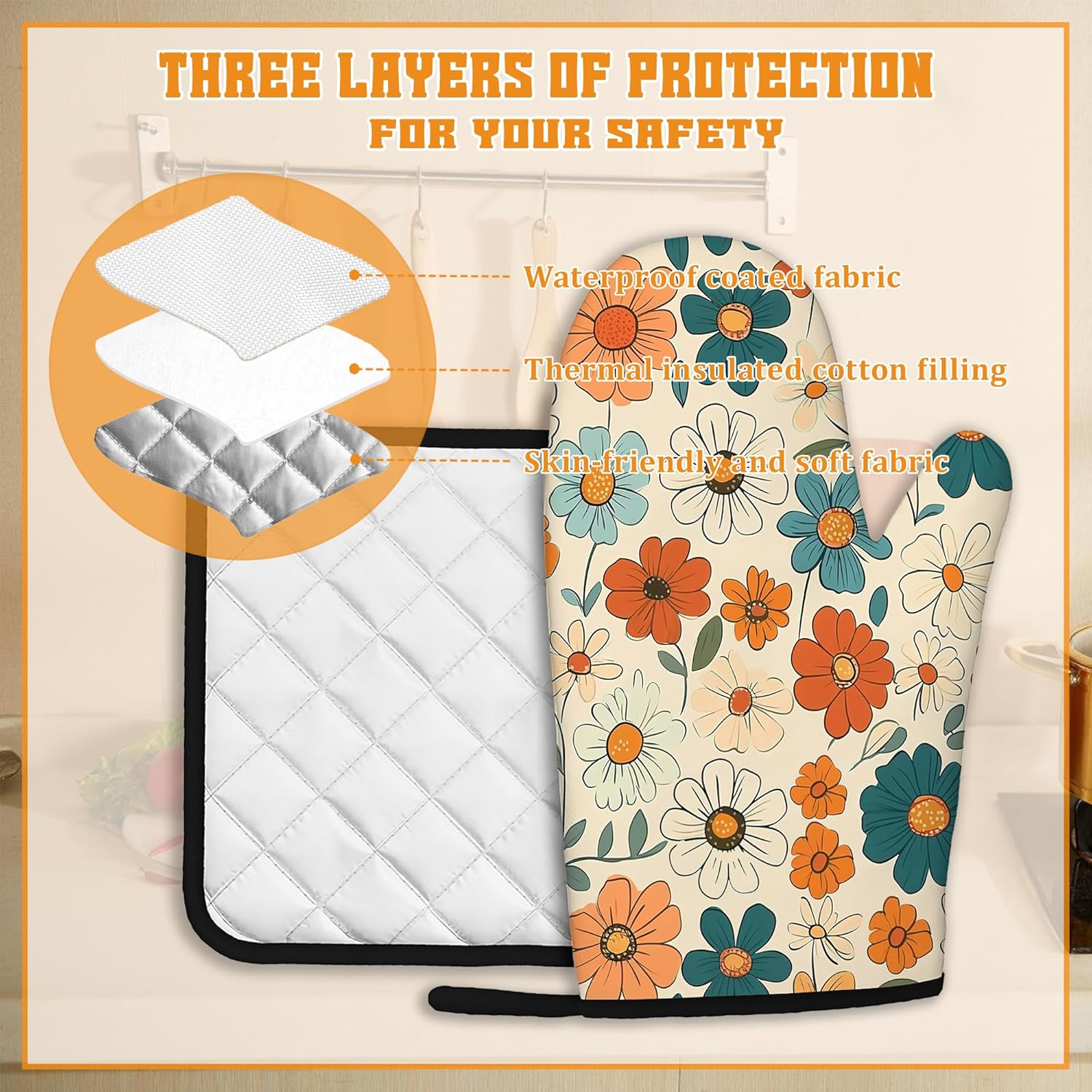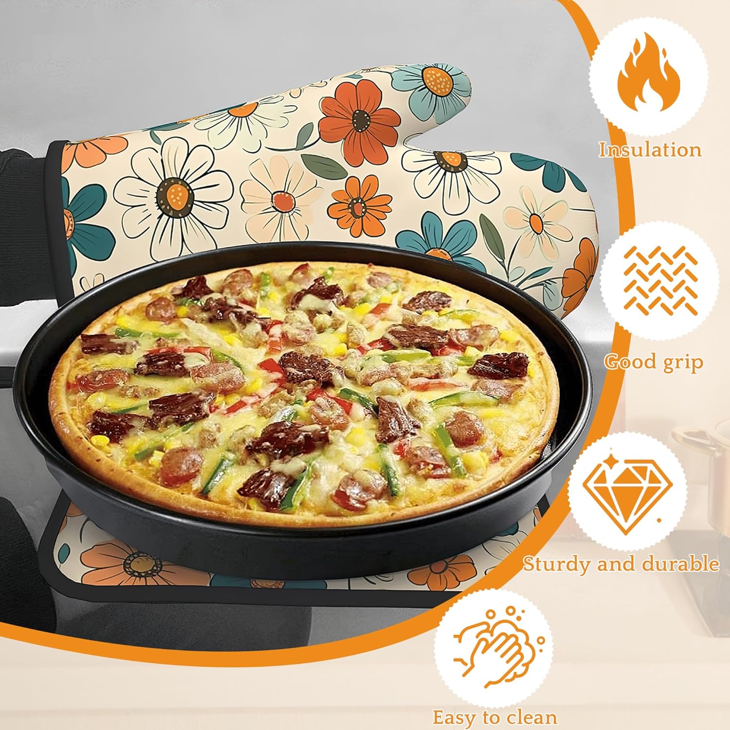 Vintage Floral Oven Mitts and Pot Holders,Groovy Flower Heat Resistant Oven Mitts Gloves and Pot Holder for Home Kitchen Decorations Cooking Baking BBQ Gifts,Set of 4