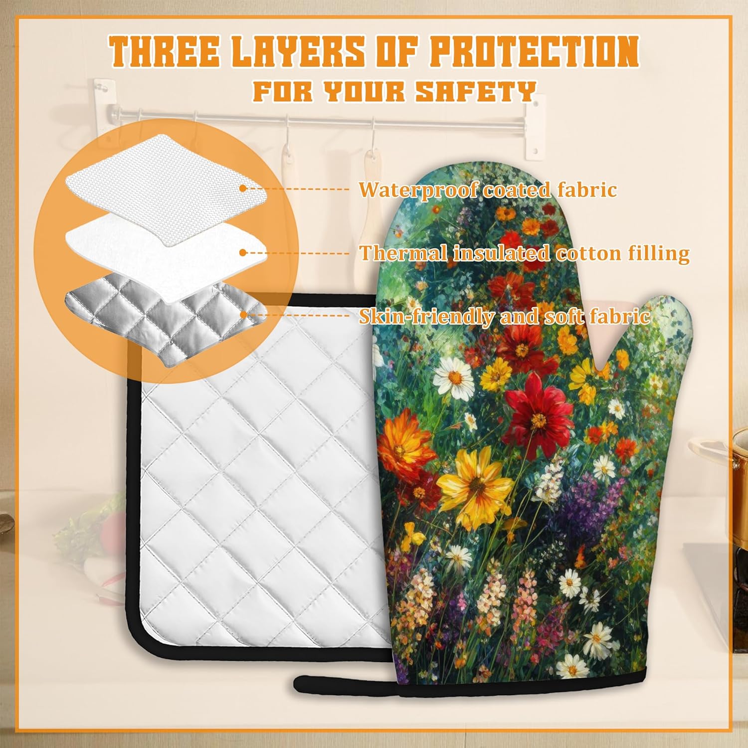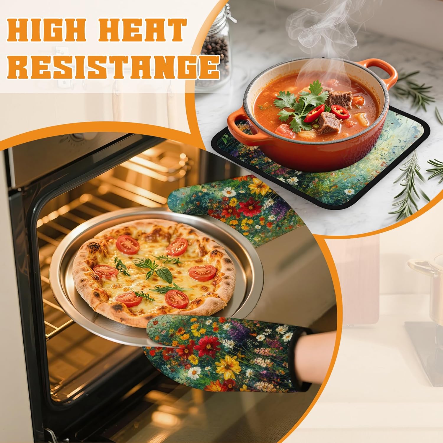Vintage Flower Fields Oven Mitts and Pot Holders,Heat Resistant Oven Mitts Gloves and Pot Holder for Home Kitchen Decorations Cooking Baking BBQ Gifts,Set of 4