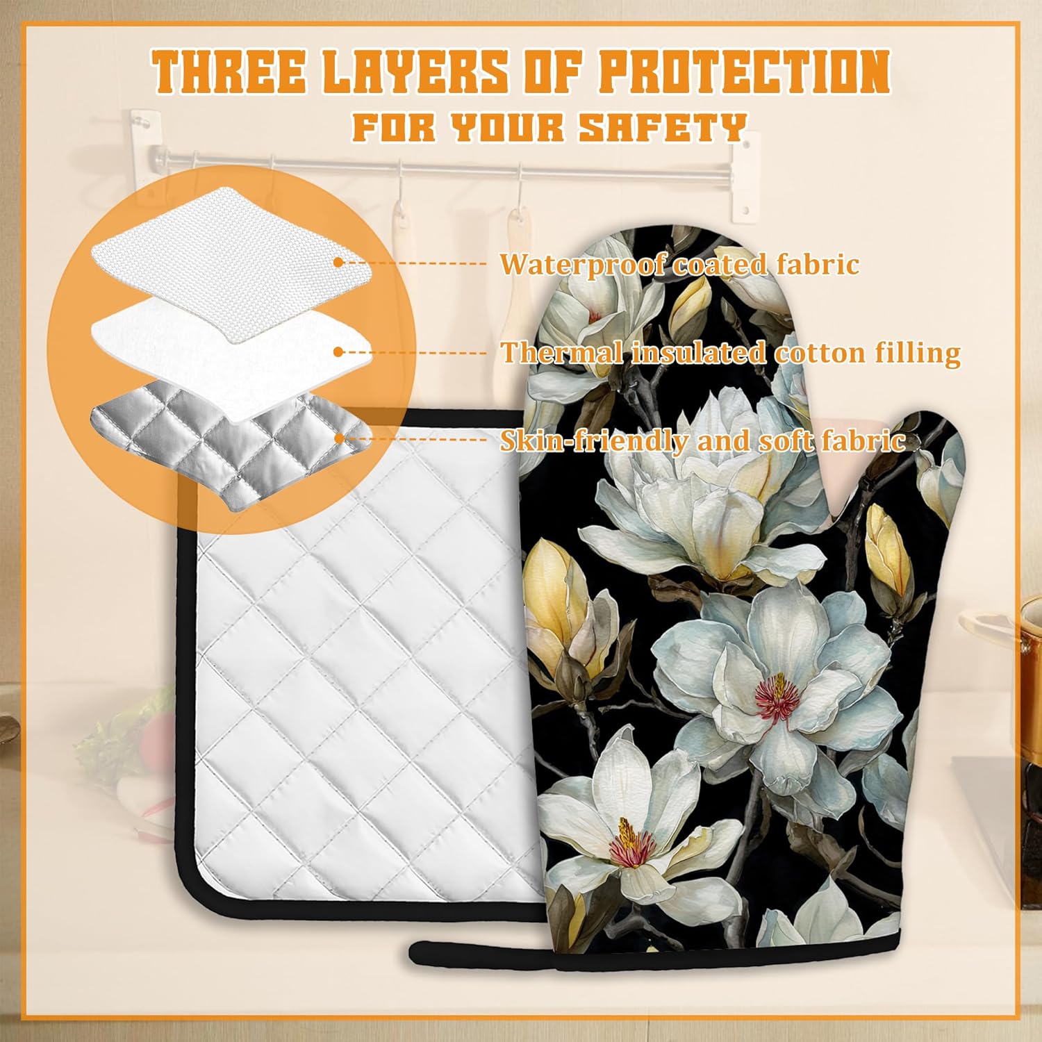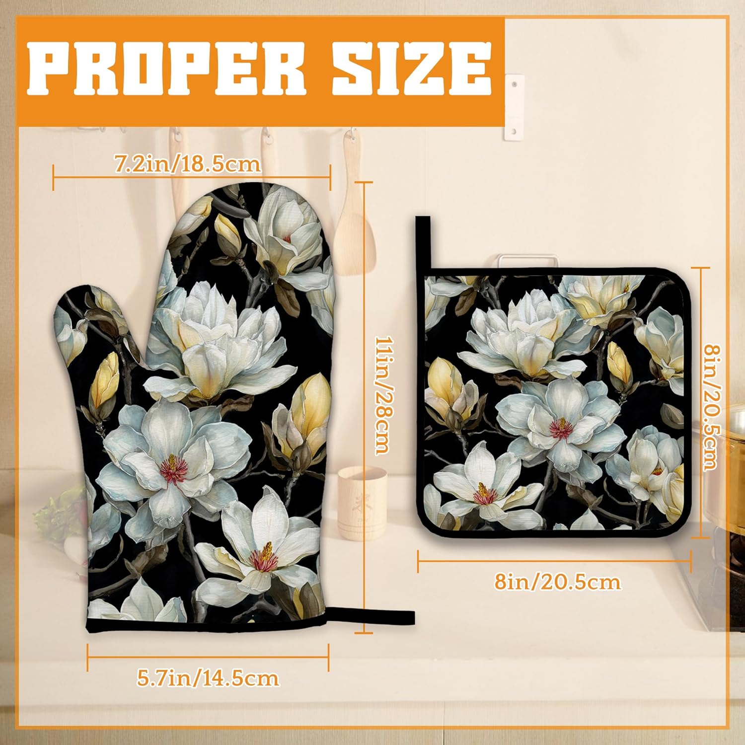 - Stylish Design:Vintage White Magnolia patterns bright colors,unique prints are exquisite decorations for your kitchen.Brightly colored designs will surely impress your guests and enhance the atmosphere of your kitchen,making your kitchen less monotonous and more lively.
