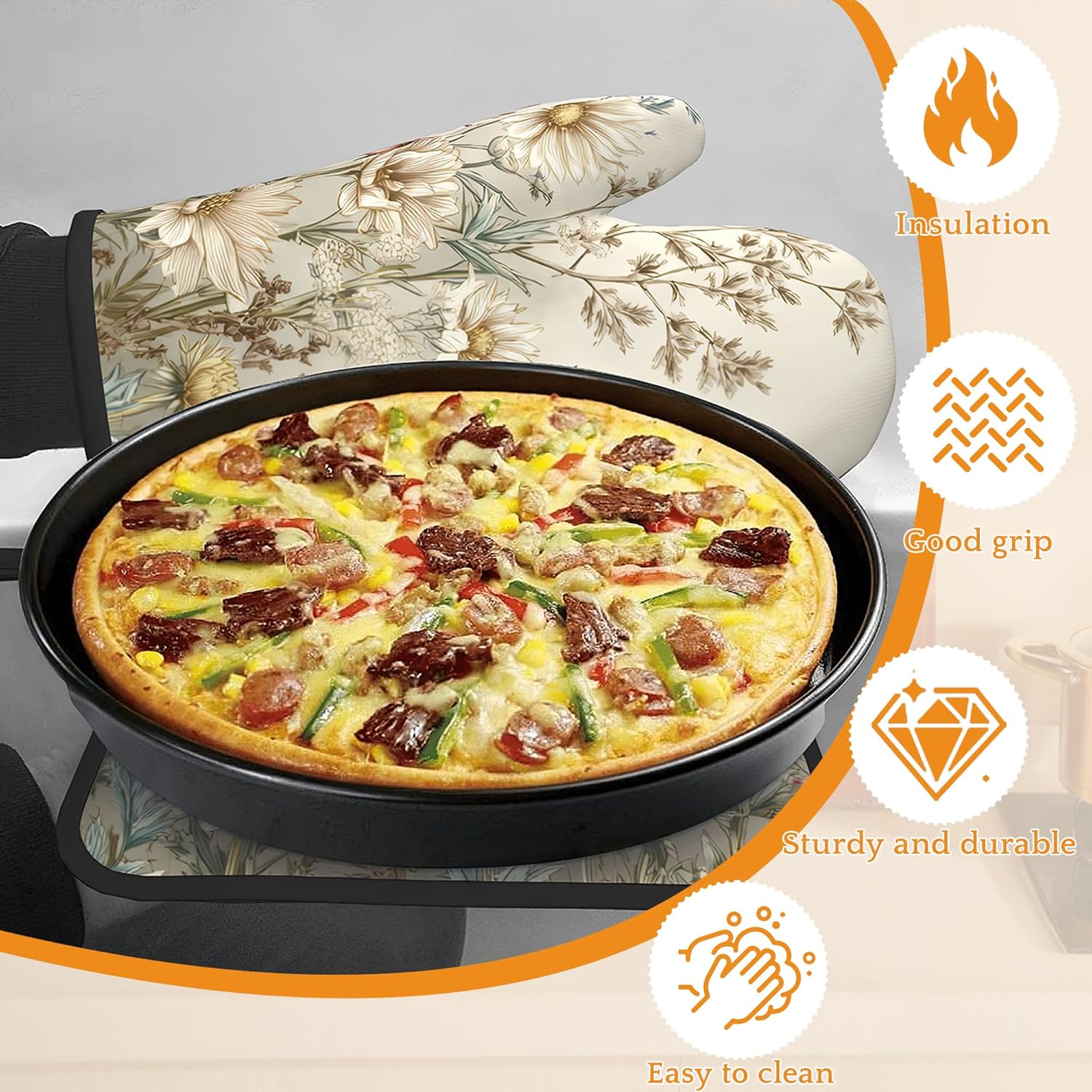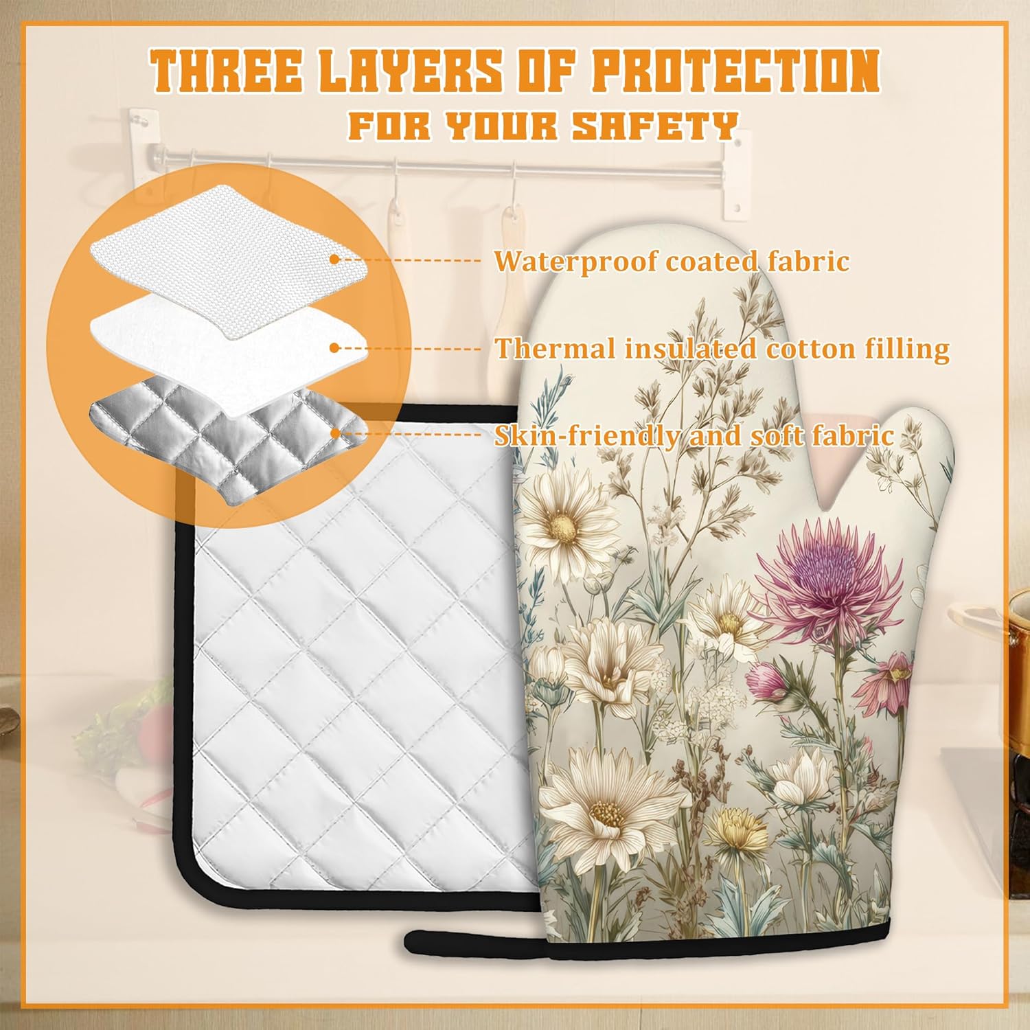 Vintage Wildflowers Oven Mitts and Pot Holders,Floral Botanical Herbs Heat Resistant Oven Mitts Gloves and Pot Holder for Home Kitchen Decorations Cooking Baking BBQ Gifts,Set of 4