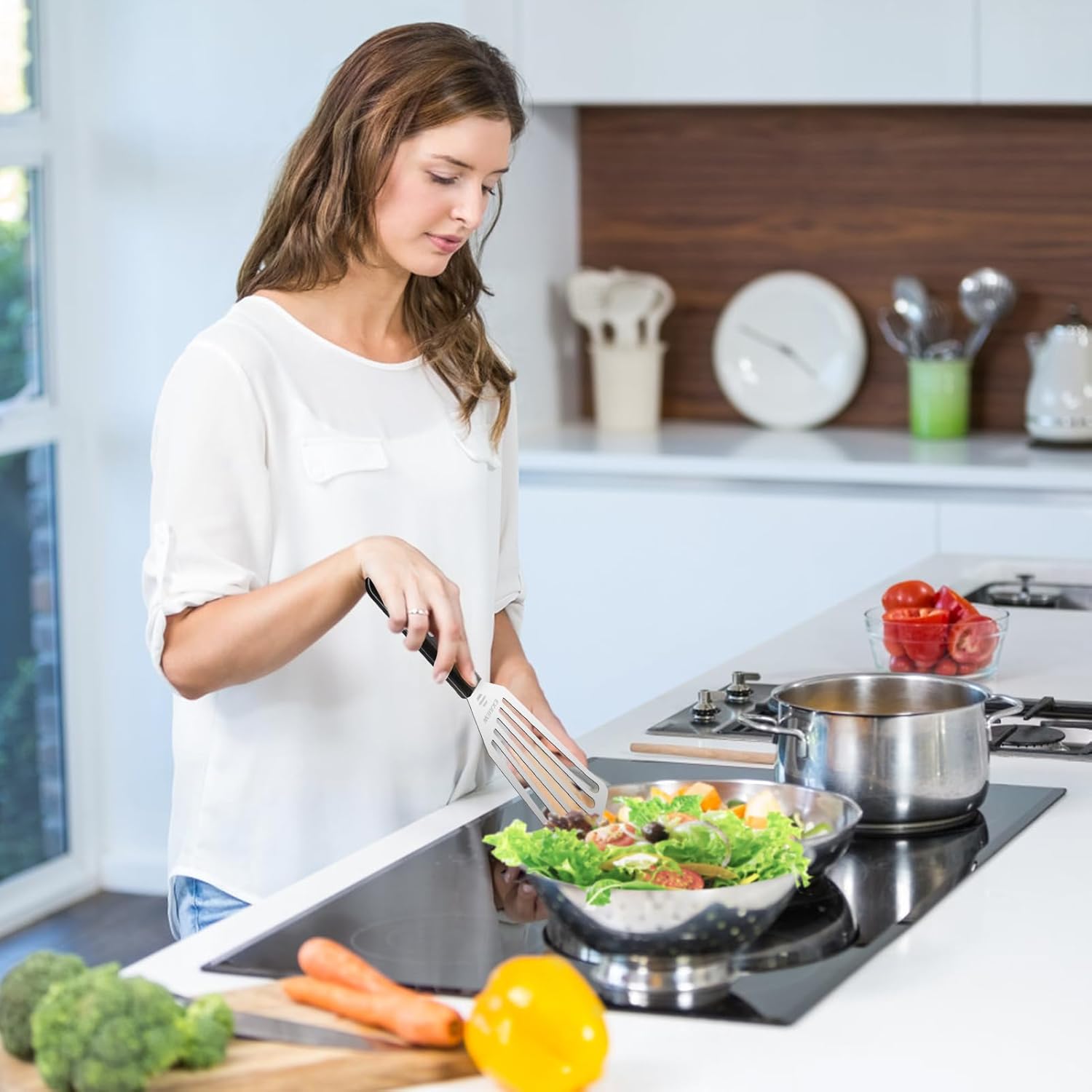 - Versatile Metal Spatulas for Kitchen Use – Suitable for most applications that require a flexible spatula: flipping pancakes, grilling burgers, cooking scrambled eggs or omelette and removing items from a roasting pan. Durable stainless steel turner spatula is perfect for flipping burgers on the grill.