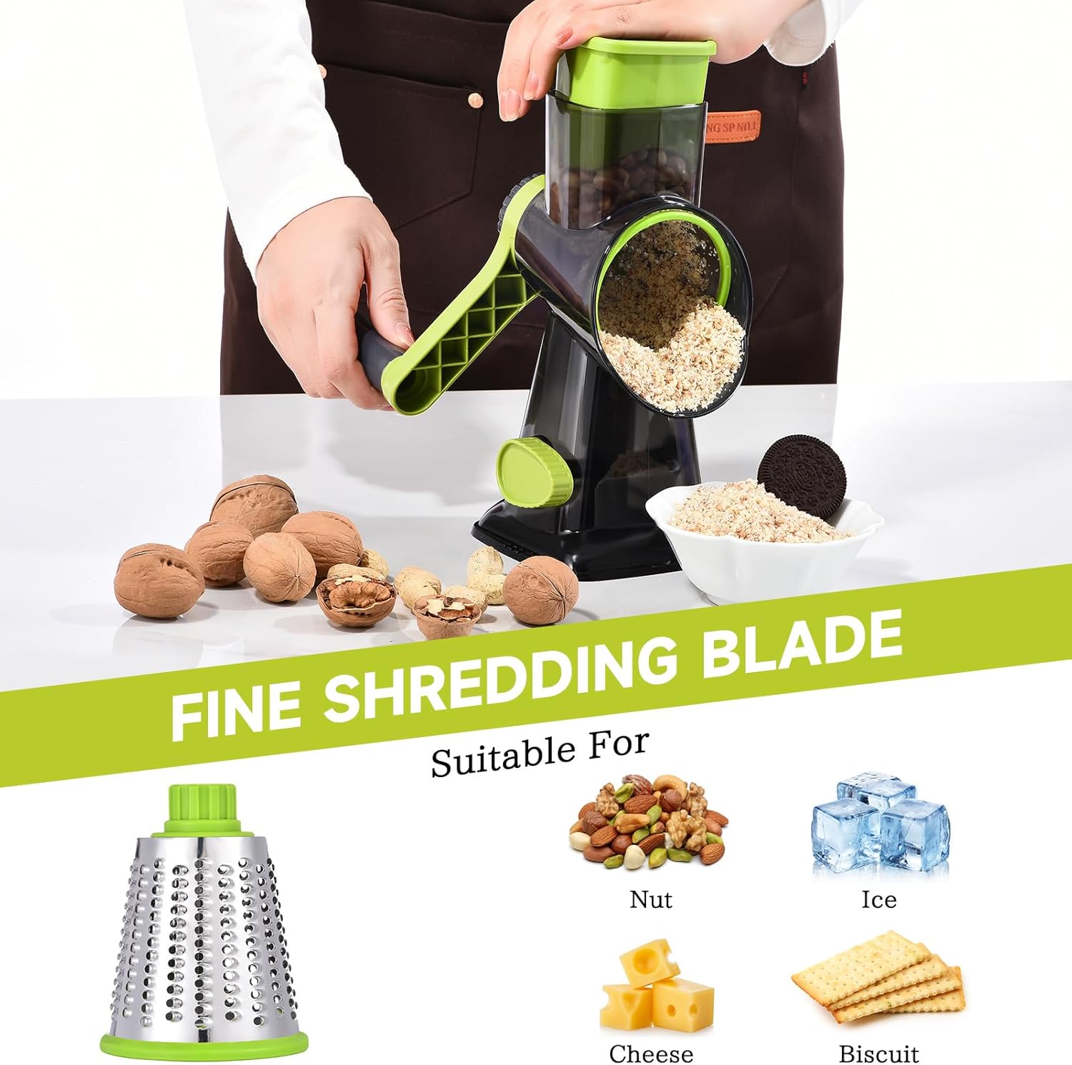 - 【3-in-1 Kitchen Versatility】Equipped with 3 drum blades for slicing, shredding, and grinding, this grater handles a range of ingredients: cheese, carrots, cucumbers, potatoes, broccoli, chocolate, and more. Use slicing/coarse blades for soft cheese and fine blades for hard cheese.