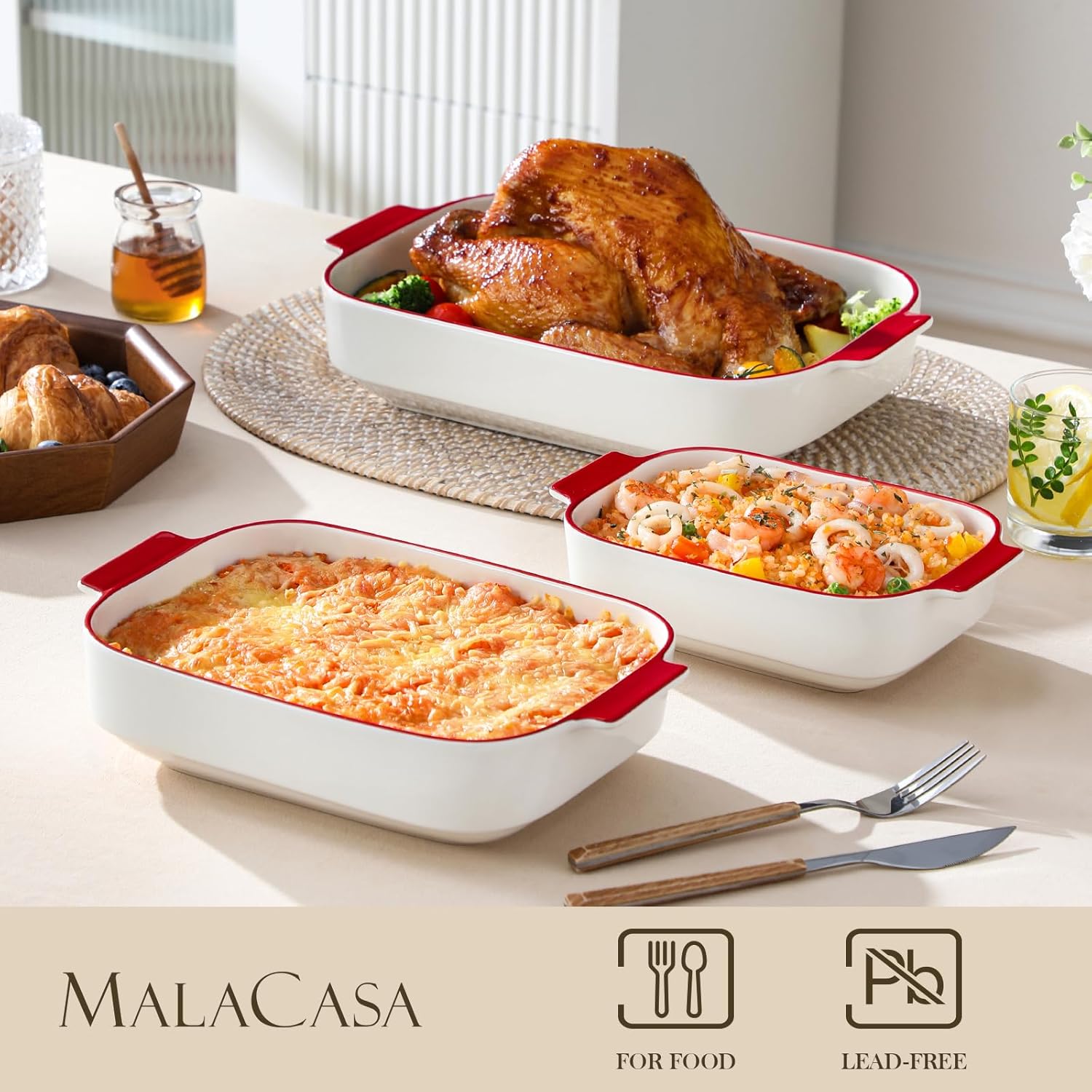 MALACASA Casserole Dishes for Oven, Ceramic Baking Dishes Set of 3, Rectangular Lasagna Pan Deep Baking Pans, Bakeware Sets with Handles Gift Set, White with Red Trim (13.8''/11.7''/9.4''), Series BAKE