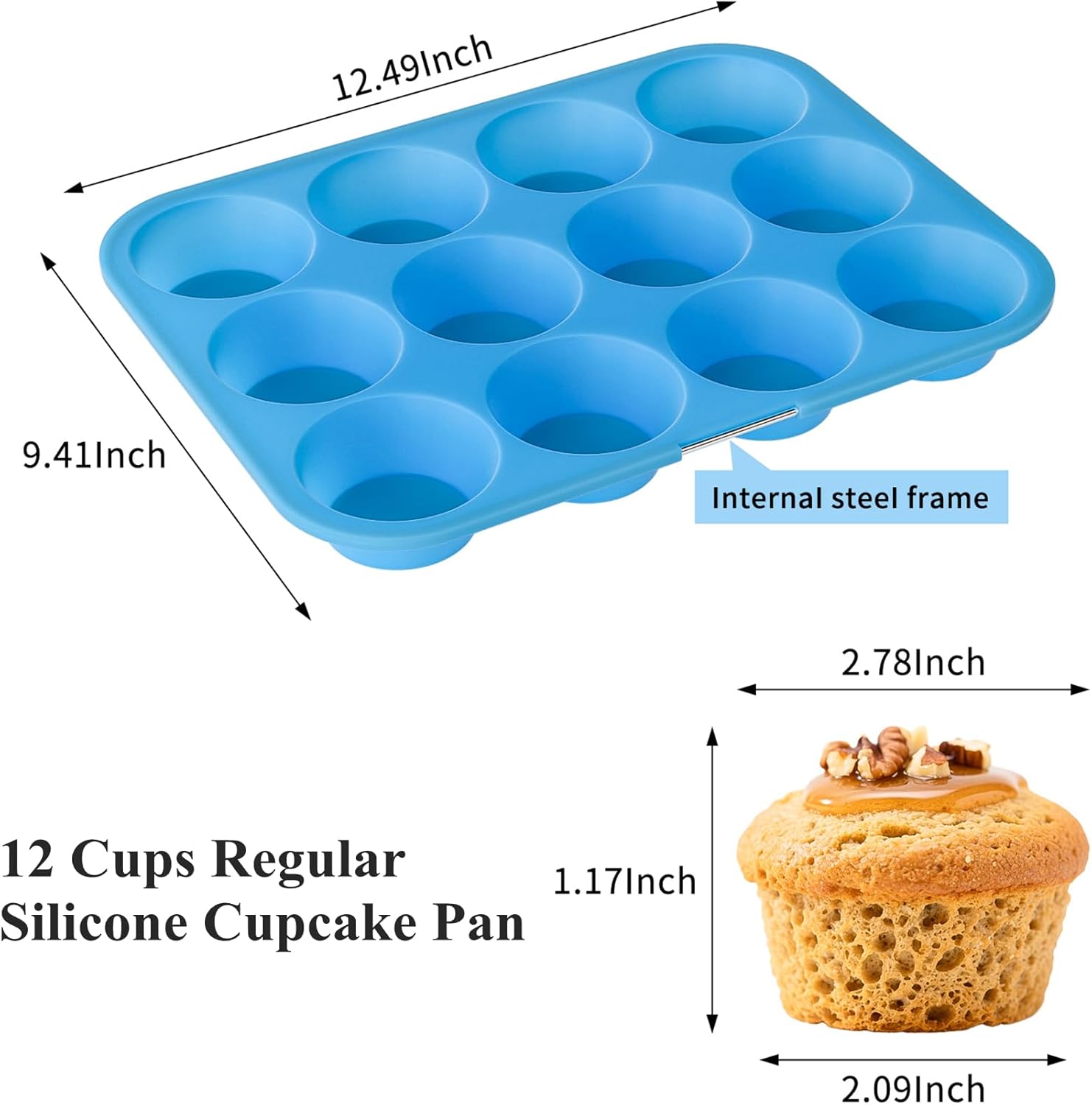 Bangp 12-Cup Silicone Muffin Pan with Metal Reinforced Frame,2 Pack Regular Size Cupcake Pan,Premium Non-Stick Bend Resistance Silicone Molds for Making Muffin,Cakes,Tart,Egg Bites (Blue)