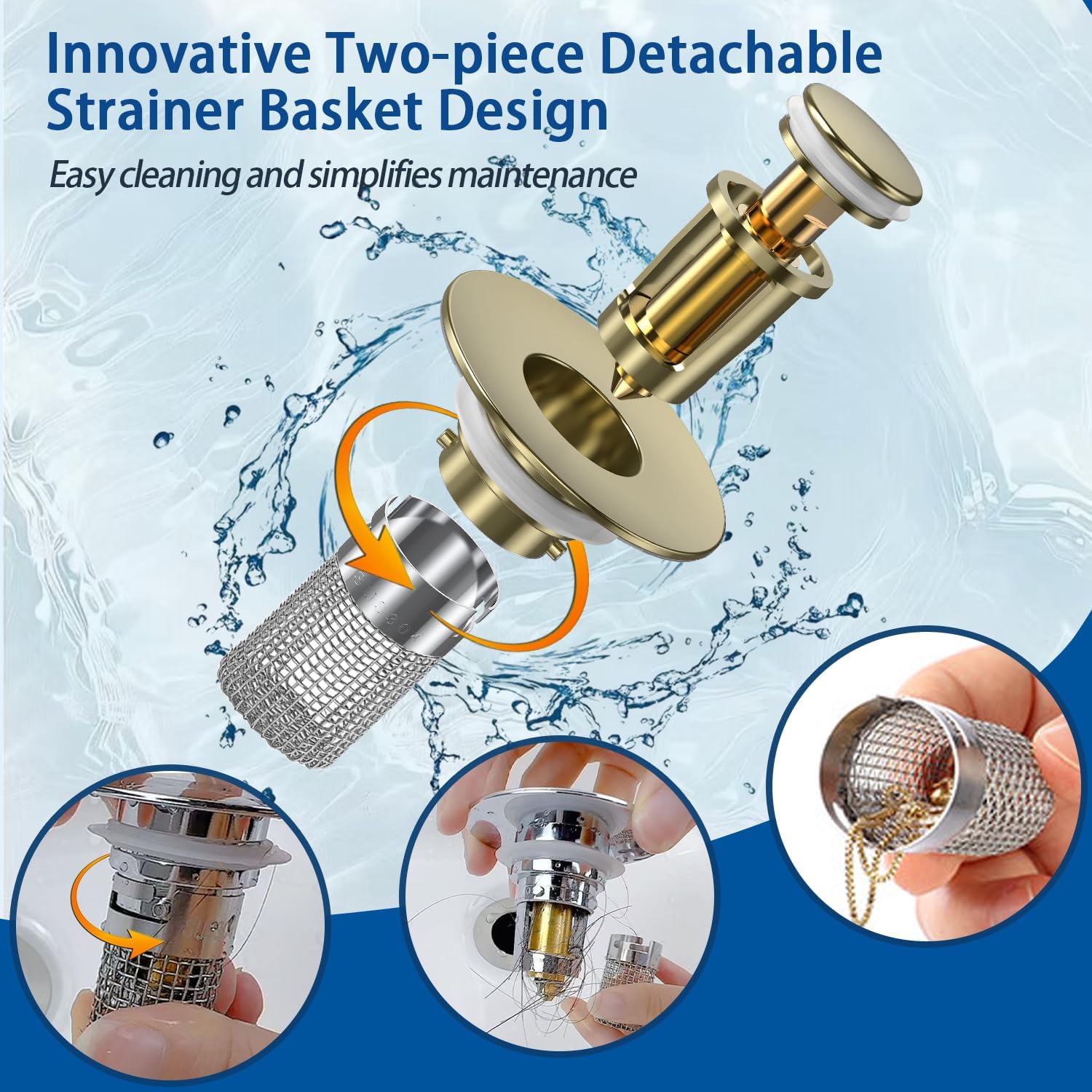 - 🔥【Pop-up Design】This bathroom sink drain strainer is engineered to catch hair and prevent clogs in your bathroom sink. The sink stopper features an easy-to-use pop-up mechanism that makes it easy and convenient to open and close the drain. With a diameter range of 1.1-1.45 inches, it fits most American bathroom sink stopper and is an effective drain strainer. The brass core construction ensures durability and long-lasting performance, making it a great choice for all bathroom sinks.
