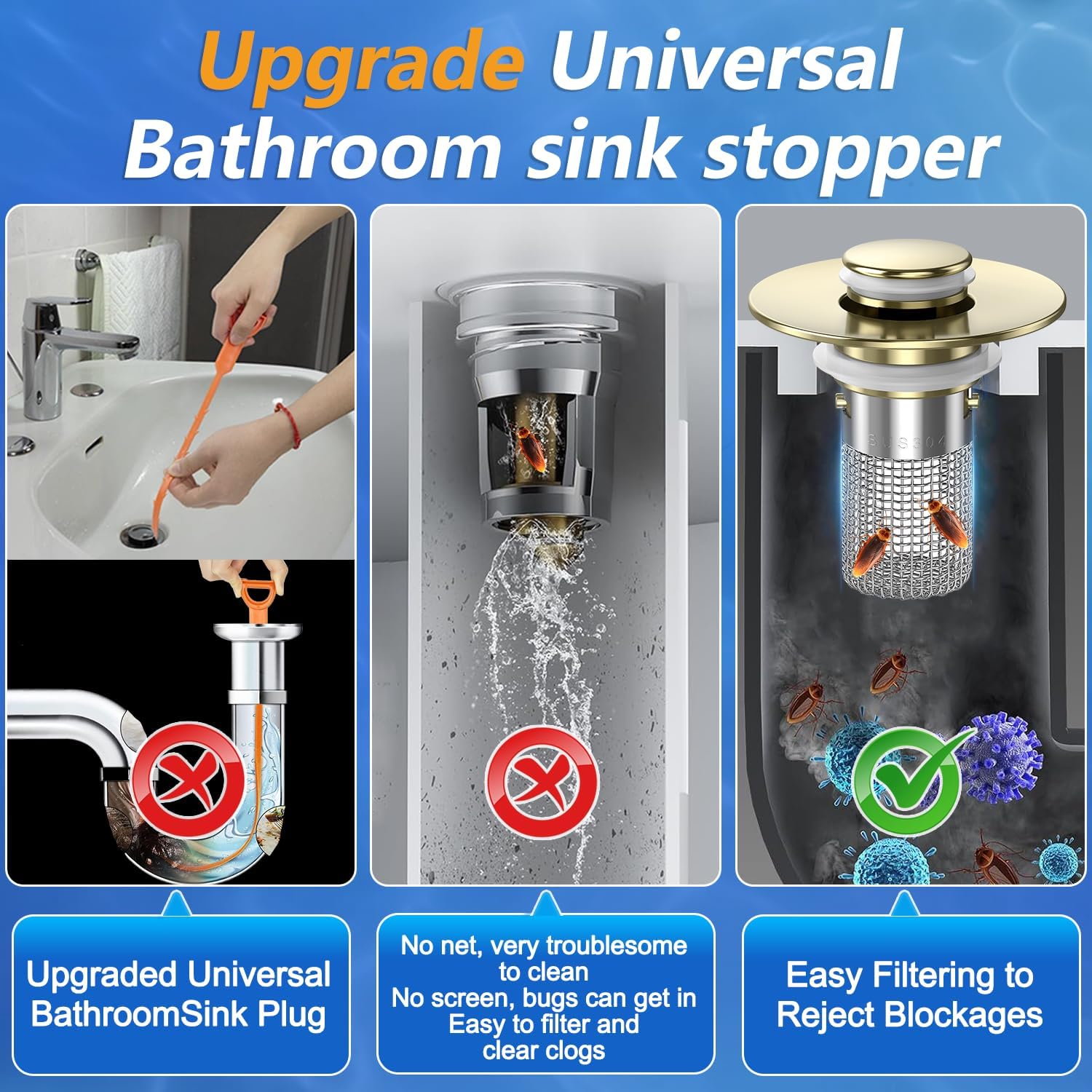 - 🔥 【2-in-1 Innovative Design 】Our sink bounce core drain strainer features an advanced 2-in-1 design that seamlessly integrates an anti-clogging basket. It combines clogging and filtration to effectively intercept hair and debris, prevent clogging, and ensure smooth drainage. With this smart design, you will experience hassle-free maintenance and an always clog-free sink