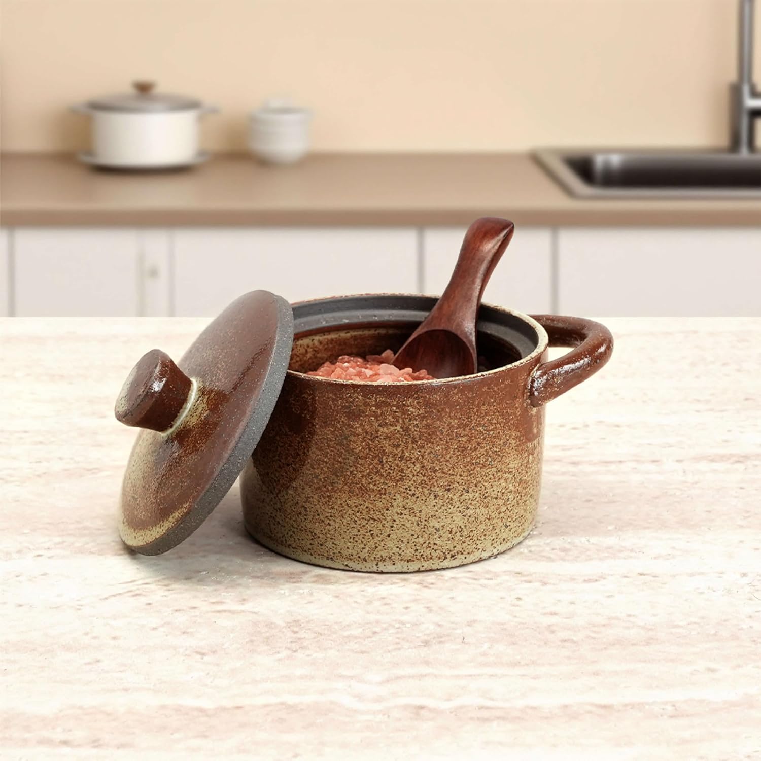 Handcrafted Speckled Ceramic Salt Cellar with Wooden Spoon, Rustic Vintage Spice Jar, Dishwasher Safe, 8.45 fl oz (Peckled Ceramic)