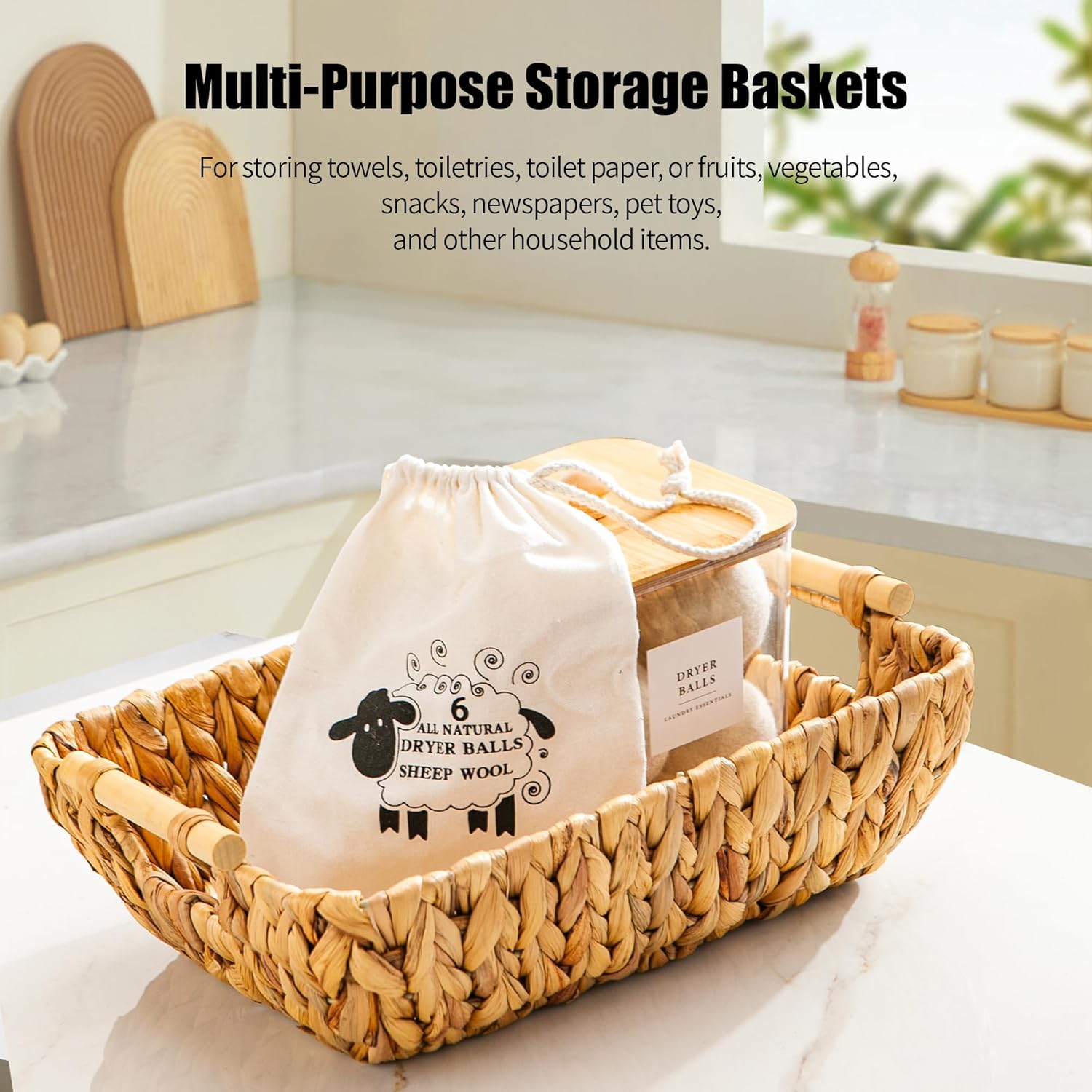 Woven Storage Baskets – Set of 2 Handwoven Water Hyacinth Wicker Baskets with Wooden Handles for Organizing, Decorative Baskets for Laundry Room, Home Decor - Large & Medium