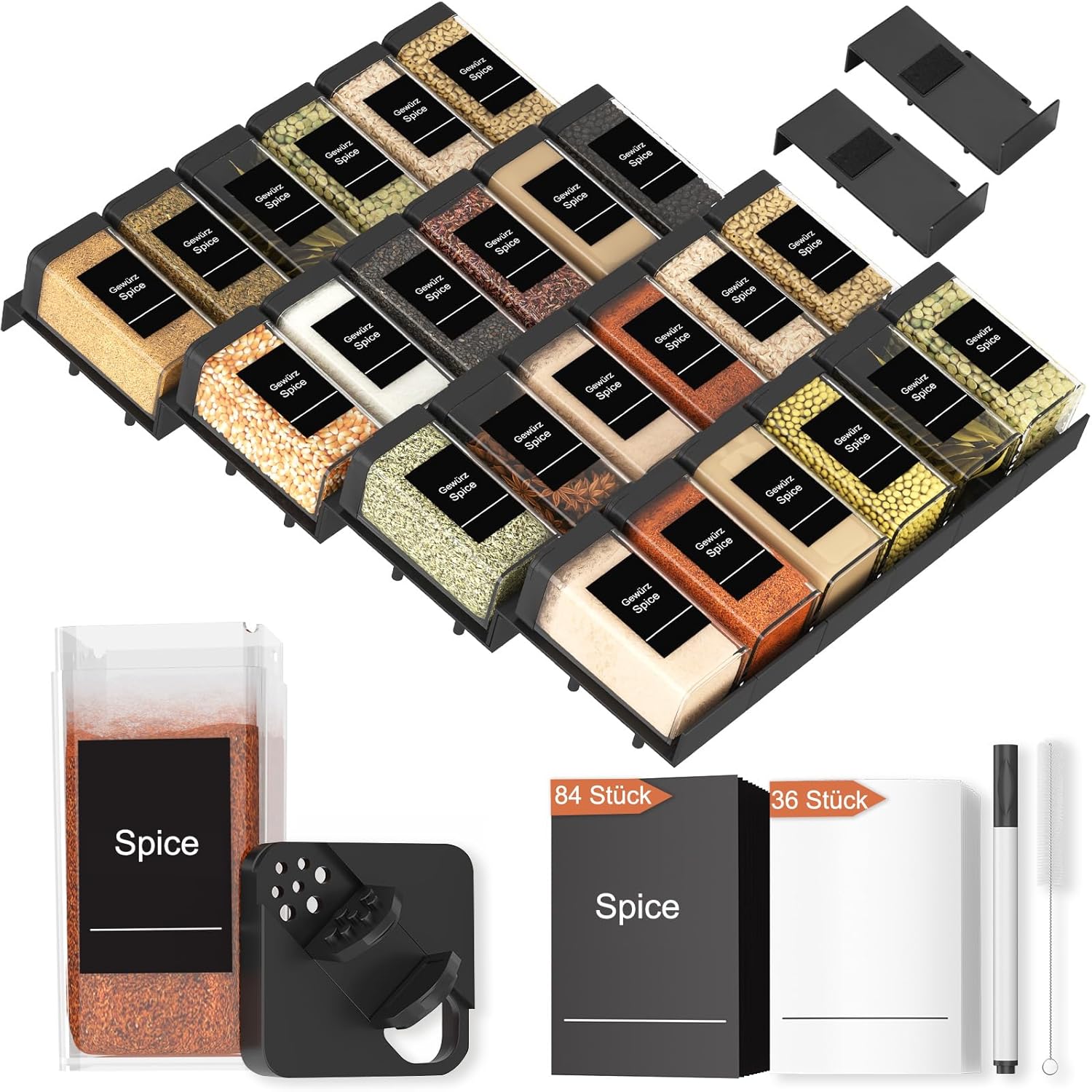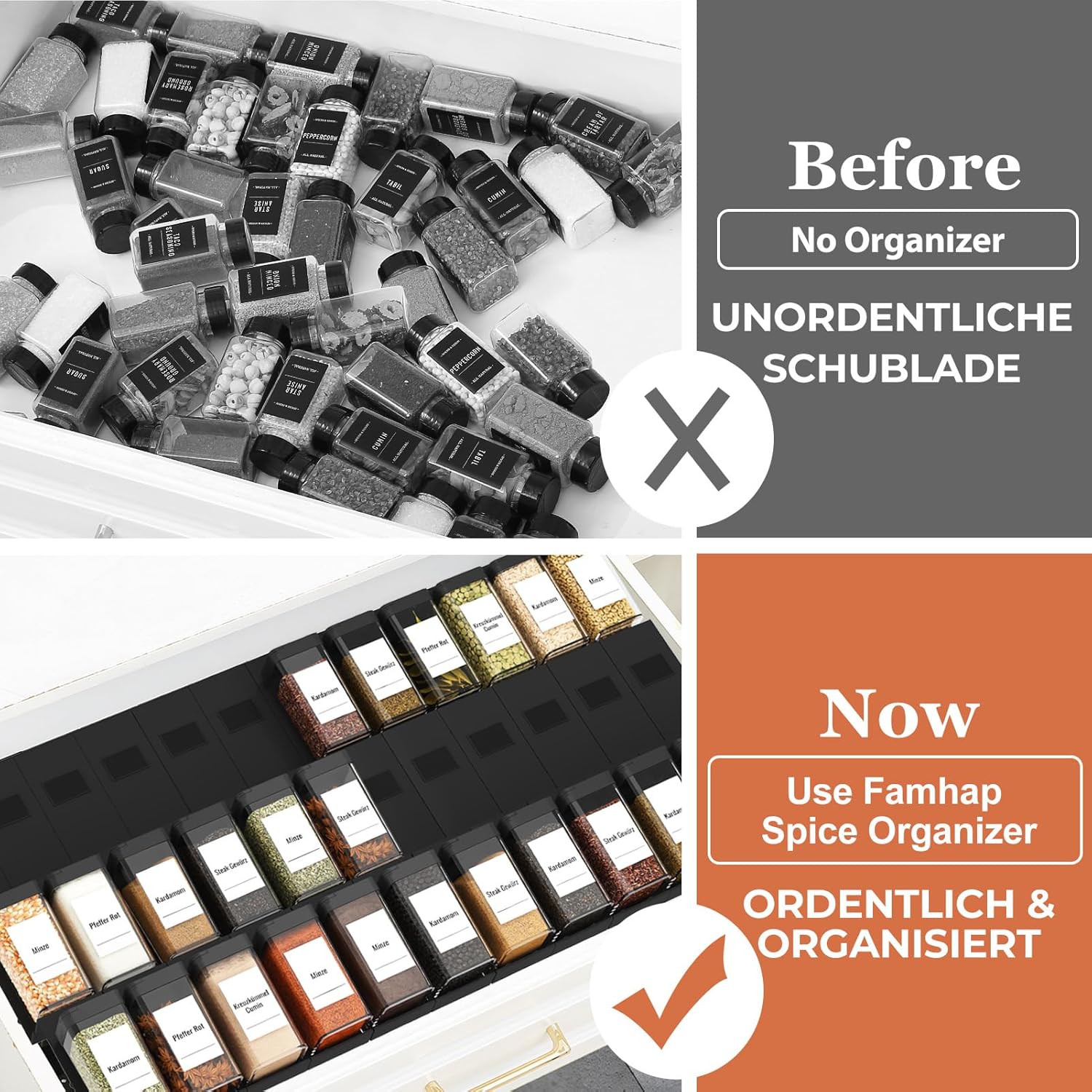 - Spice Storage Set: The Famhap spice drawer organizer set consists of 24 individual interlocking drawer inserts, 24 square plastic spice jars, spice labels, 1 pen and 1 brush for a complete spice rack storage set for your kitchen drawers.