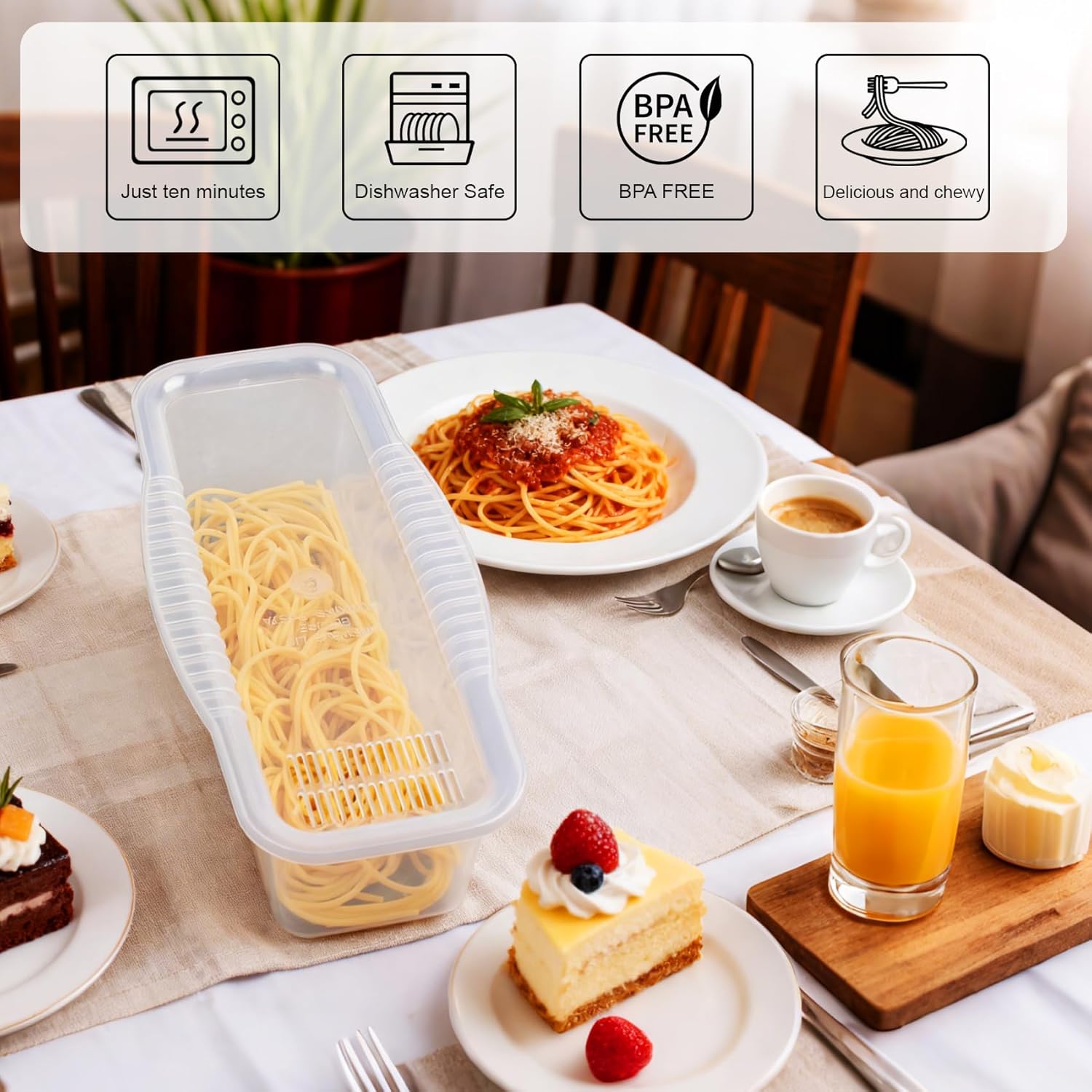 - 【Marks + Guide: Perfect Pasta】This spaghetti cooker comes with a dedicated water level card and detailed illustrated cooking guide. They help you easily get the right water-to-pasta ratio, control cooking results precisely, and avoid overcooked or undercooked noodles. Even kitchen beginners can follow instructions to use this microwave pasta maker, cook perfect pasta on the first try, and enjoy the pride of going from novice to pro.