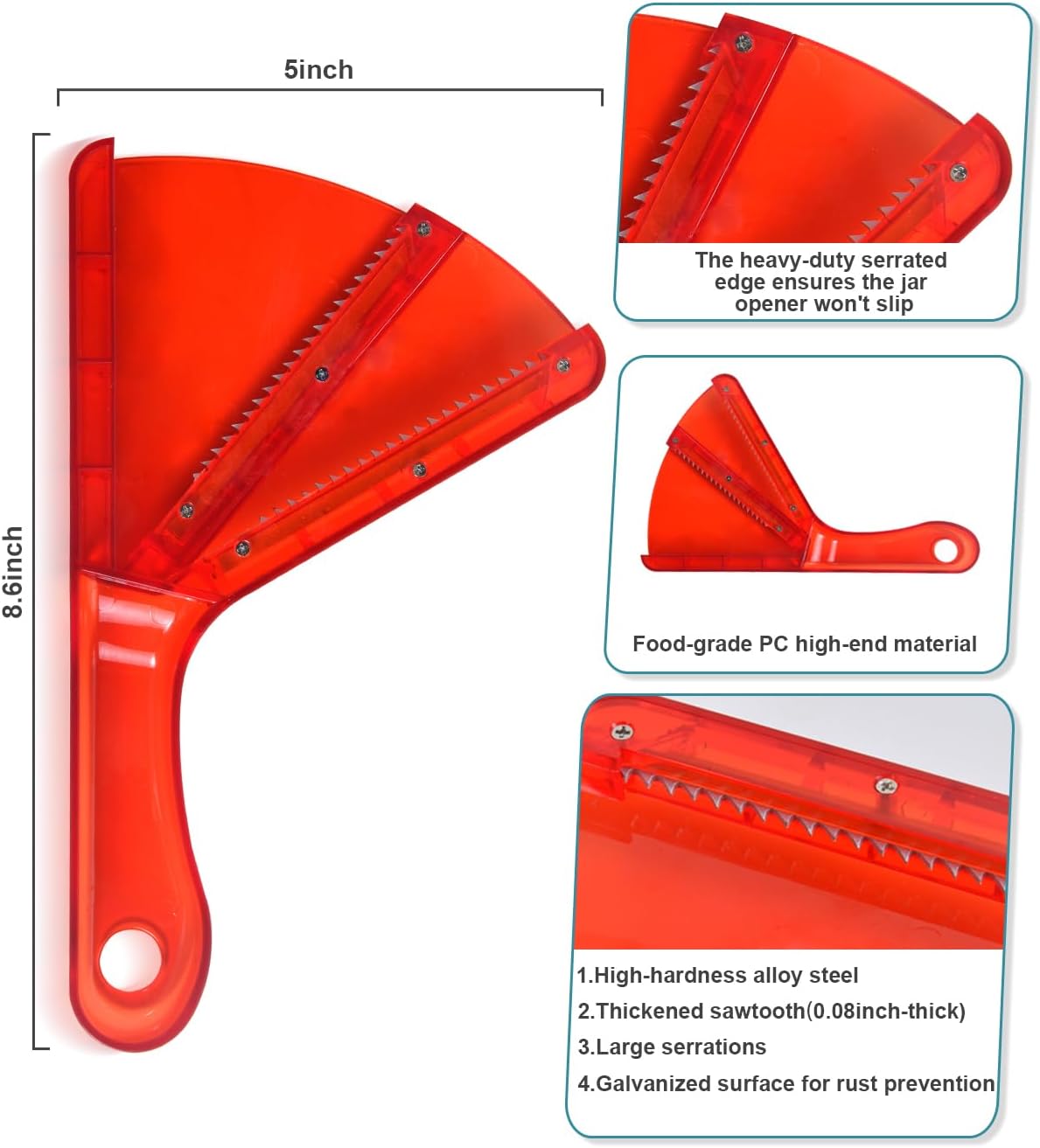 - šOur Advantages: This jar opener is made of high-quality food-grade PC material, with a jar opener gripper featuring 0.08inch-thick high-hardness alloy steel teeth. This ensures the lid opener wonāt slip, making it a reliable kitchen gadget