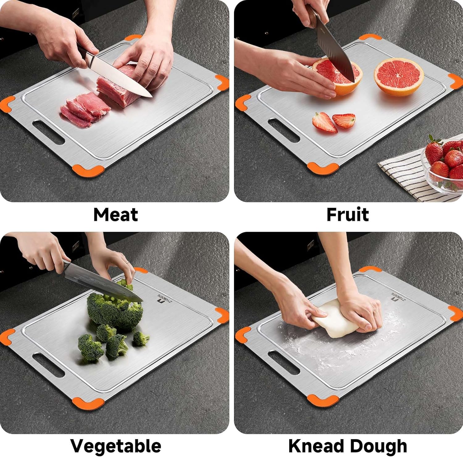 100% Pure Titanium Cutting Board with Grooves, Update Double Side Titanium Chopping Board, Silicone Anti-slip Stainless Cutting Boards for Kitchen 10 * 14 IN, Orange