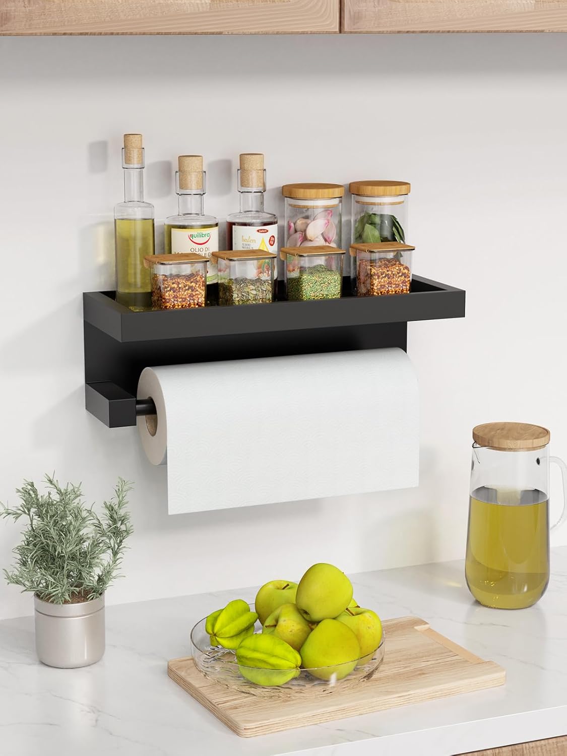 3-in-1 Paper Towel Holder Magnetic Adhesive Wall Mount - Paper Roll Holder with Shelf Under Cabinet, Kitchen Essentials for New Home Apartment Decor, RV Camper Organization Must Haves, Black