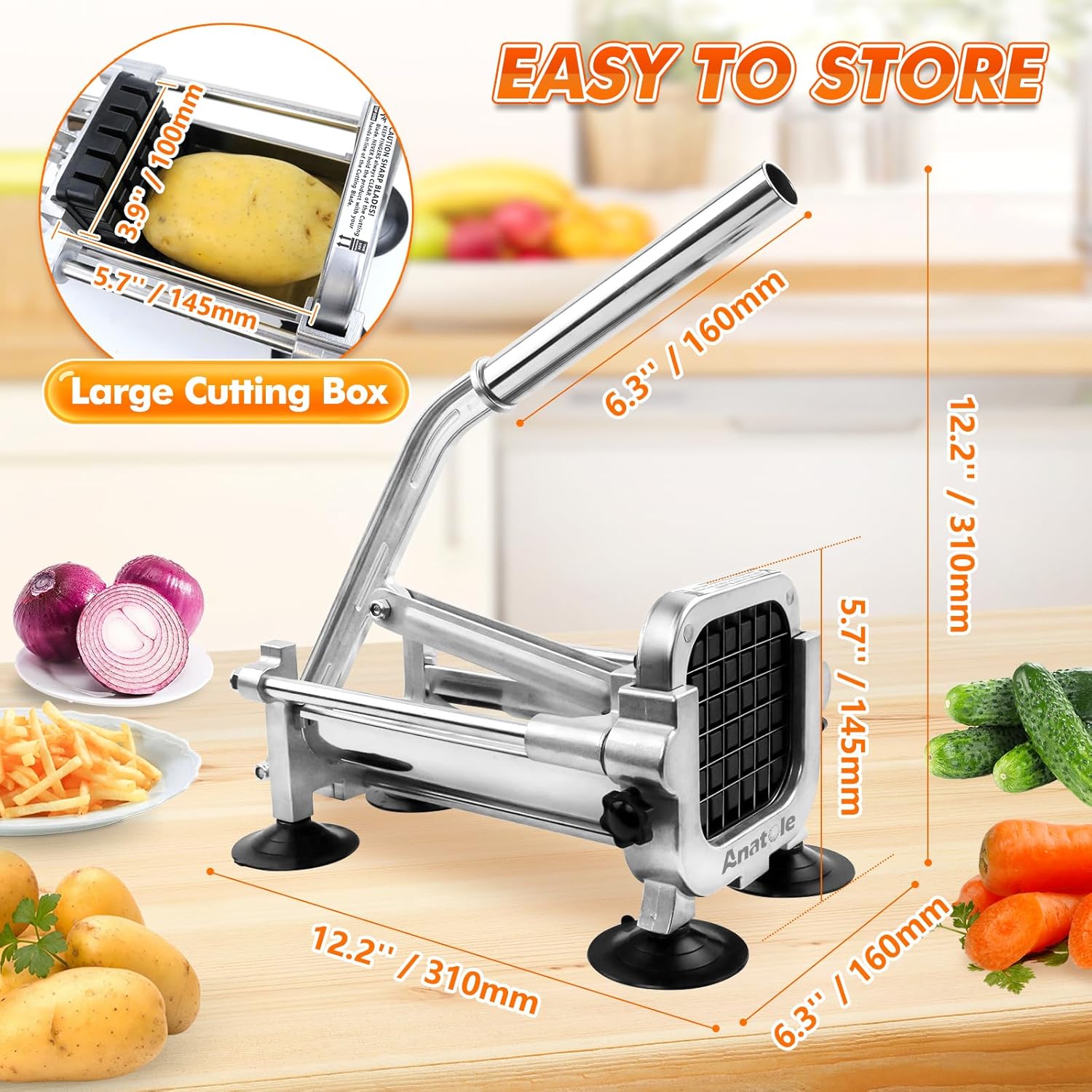 - Large Cutting Box: With a 3.9β*5.7β large cutting box, this potato chopper is big enough to handle a whole potato, onion, and most vegetables; fast and even cutting, you can make restaurant-quality fries at home with ease