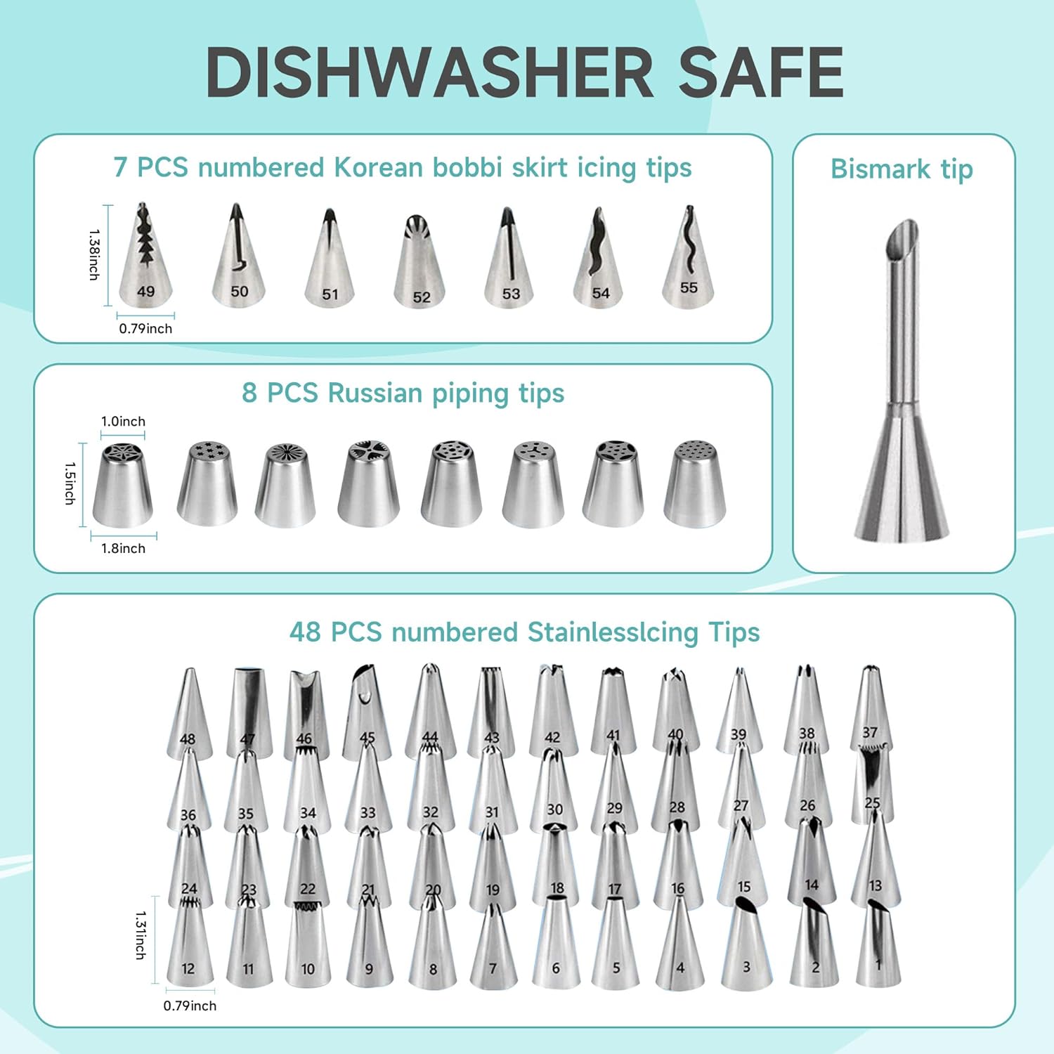 - Piping Bags and Tips Set: Includes 64 numbered icing piping tips, 30 disposable & 2 reusable 12β frosting pasty bags. Allow you to create a variety of designs, including simple dots and lines as well as intricate flowers and leaves. The included coupler makes changing tips on your piping bags a breeze without emptying the bag or creating any mess.