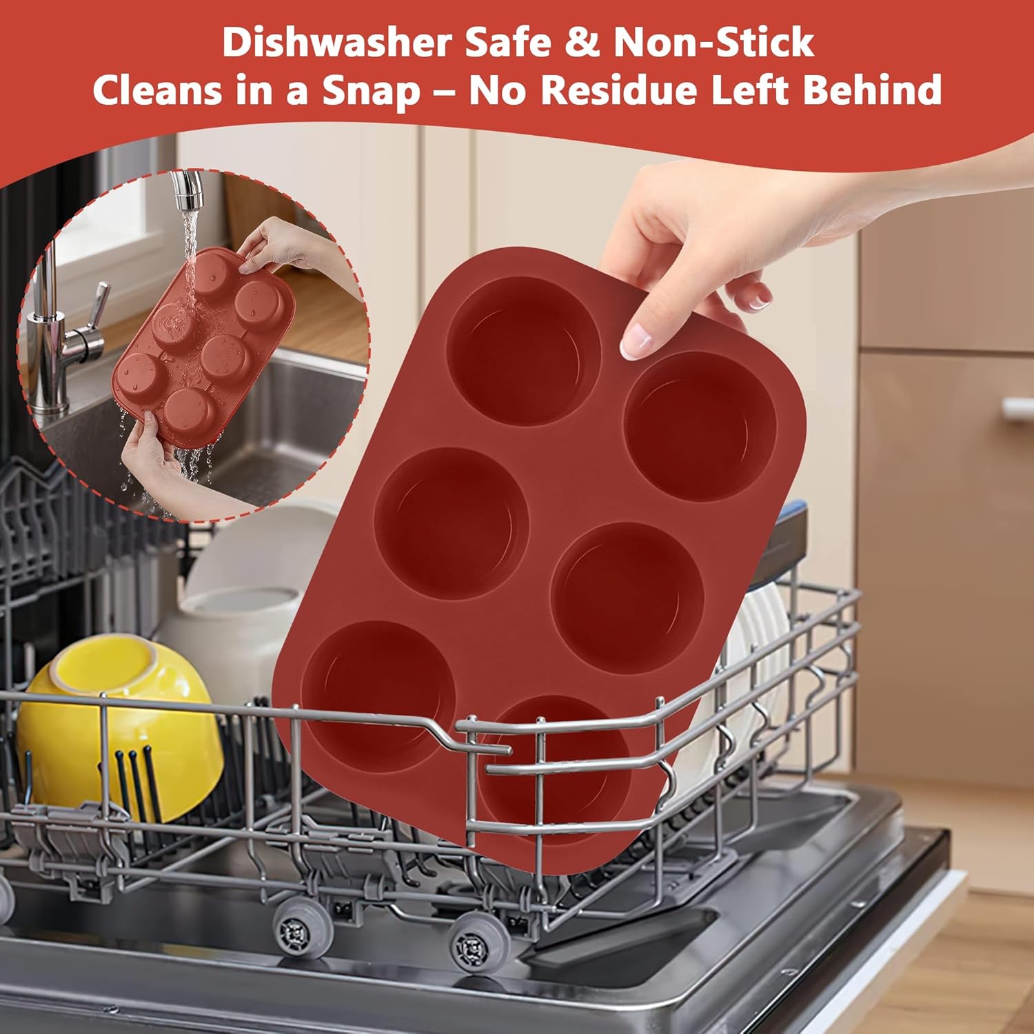 • The flexible, non-stick surface allows muffins to release effortlessly without sticking. Cleaning is a breeze—just rinse or place it in the dishwasher for quick, hassle-free maintenance