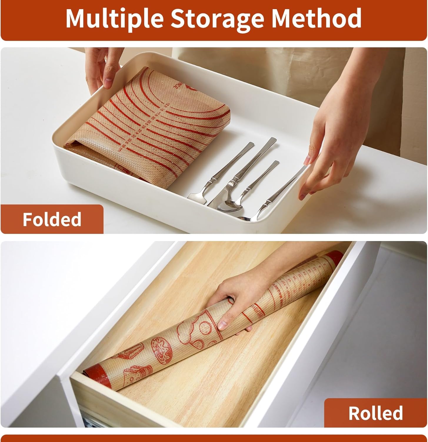 - Easy to Clean & Store:Even burnt sugar and fat falls off on its on, you can dump the crumbs in the trash in a snap. Just rinse the silicone baking mat in warm soapy water to clean it or air drying will be enough. It is also microwave and dishwasher safe. After the mat is dried, simply fold or roll it up and easy to store