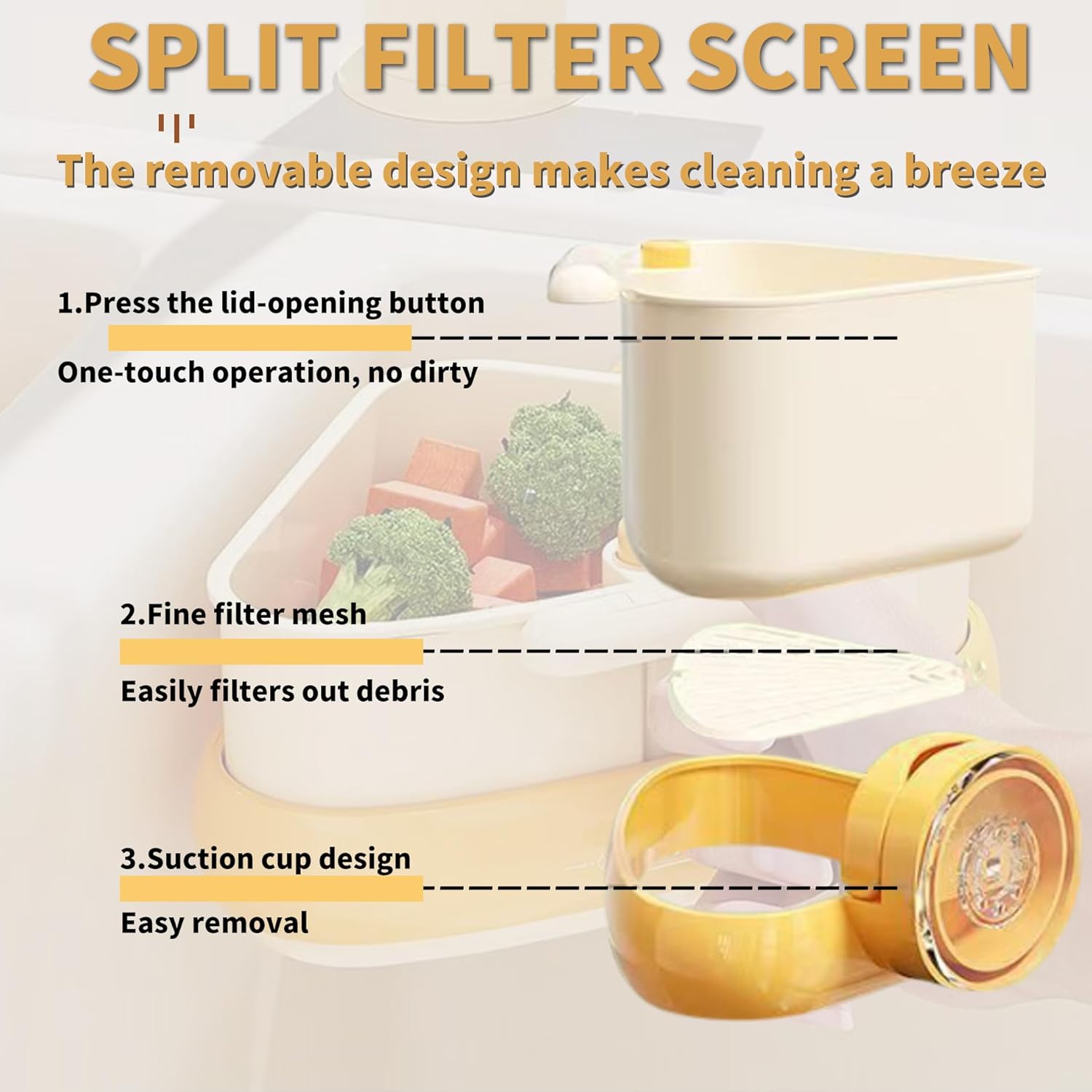 - 【Touchless Drain】Say goodbye to messy sinks and hassle. Simply press a button and the bottom lid automatically opens, allowing collected debris to be dumped directly into the trash can. Easy and hygienic, no need to get your hands dirty, making sink waste disposal a breeze.