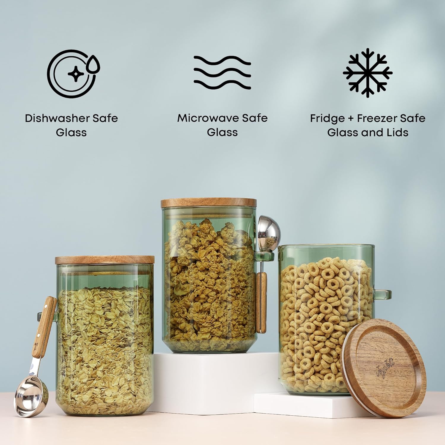 - 3 GLASS CANISTERS WITH SCOOPS: Upgrade your kitchen storage with these 32oz borosilicate glass food storage containers! Each container features a built-in handle to conveniently hold its spoon on the side, making it easy to scoop 1 tbsp of everything from morning coffee beans to evening bath salts.