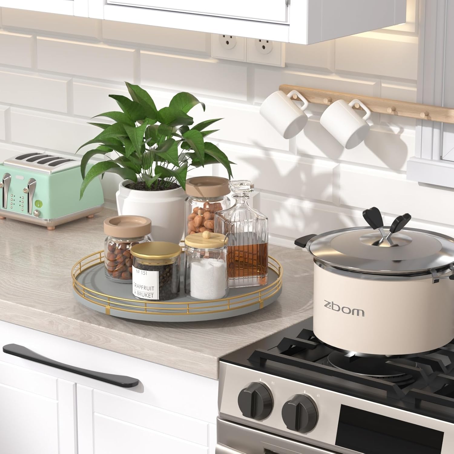12" Wooden Lazy Susan Turntable for Cabinet – Roud Rotating Spice Rack Organizer, Gray Kitchen Countertop Tray for Dining Table & Pantry Storage (Gray & Gold)