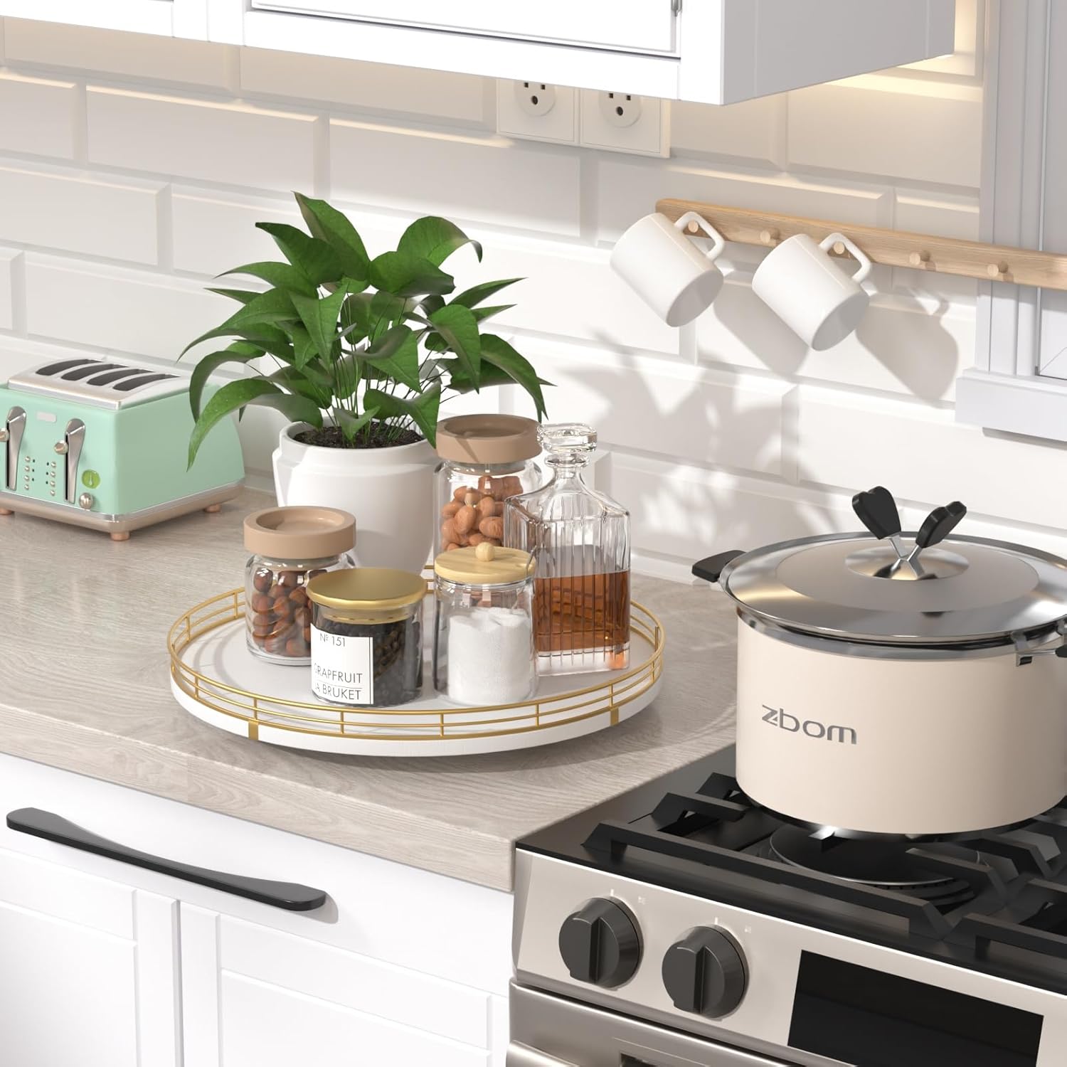 12" Wooden Lazy Susan Turntable for Cabinet – Round Rotating Spice Rack Organizer, White Kitchen Countertop Tray for Dining Table & Pantry Storage (White & Gold)