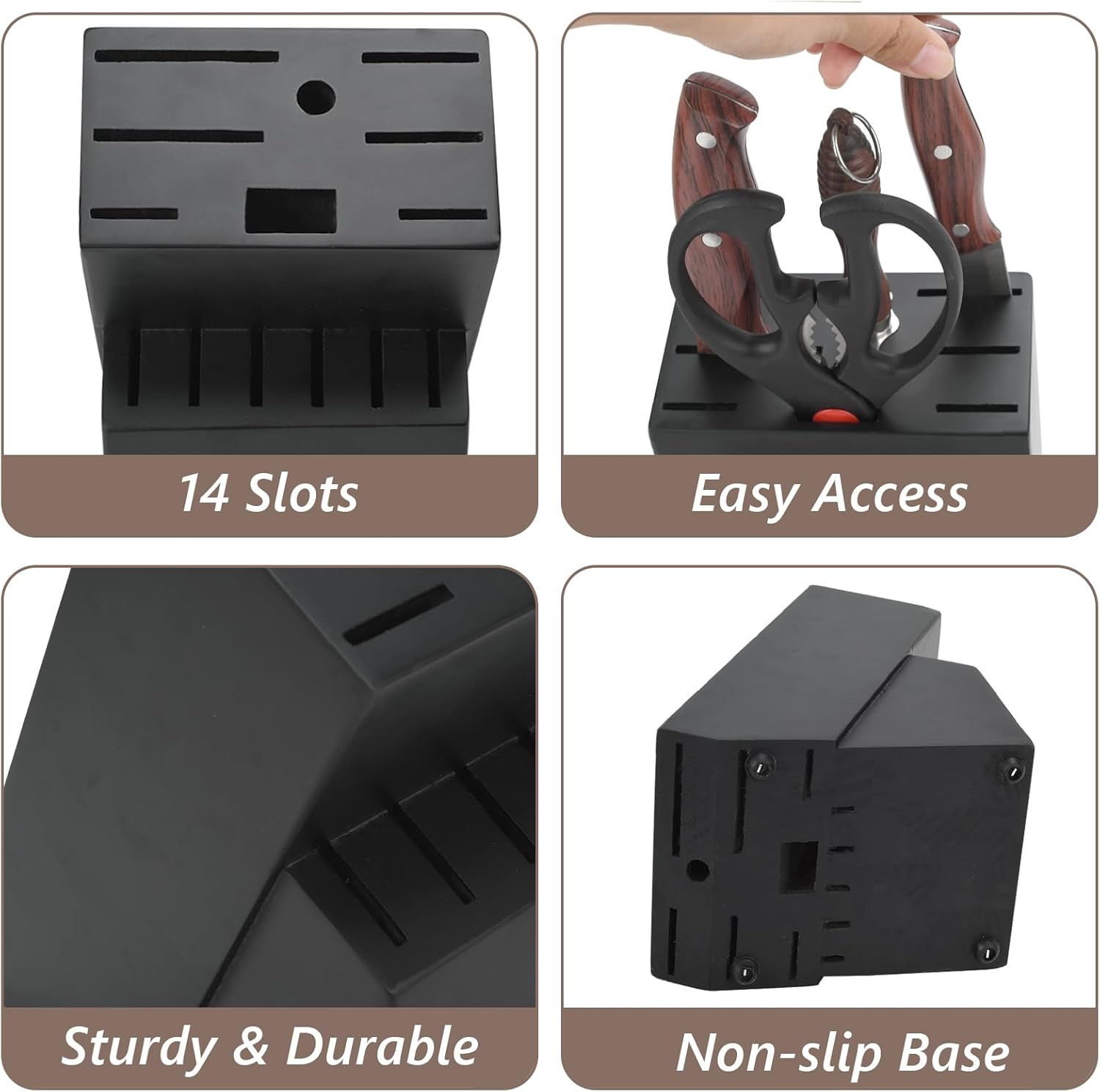 - Wood Knife Block: The size of this knife holder is 9.05*7.28*4.88(L*W*H), the 14 universal slots of various size can store different knives including bread knives, steak knives, as well as scissors and sharpening rod and other knives.