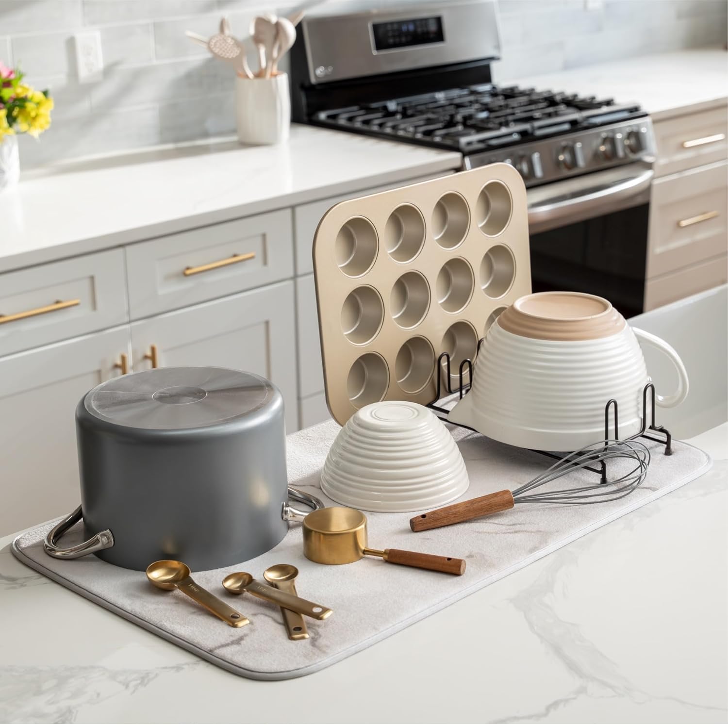 S&T INC. Dish Drying Mat Jumbo, 18” x 30”, Absorbent Microfiber Kitchen Counter Mat, Dish Drying Pad for Dishes, Utensils, Pots and Pans, Jumbo, Grey Stone