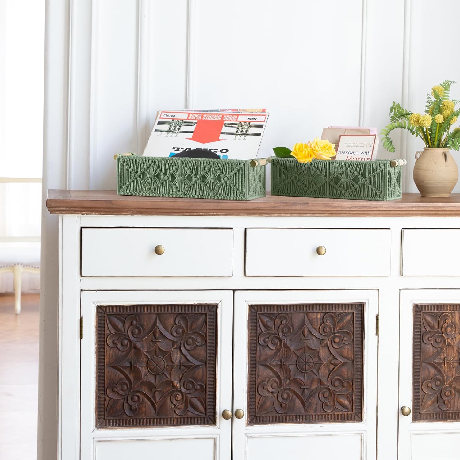 Mkono Macrame Storage Baskets Boho Decor Box Handmade Woven Decorative Countertop Toilet Tank Shelf Cabinet Organizer for Bedroom Livingroom Home, Set of 2, Green