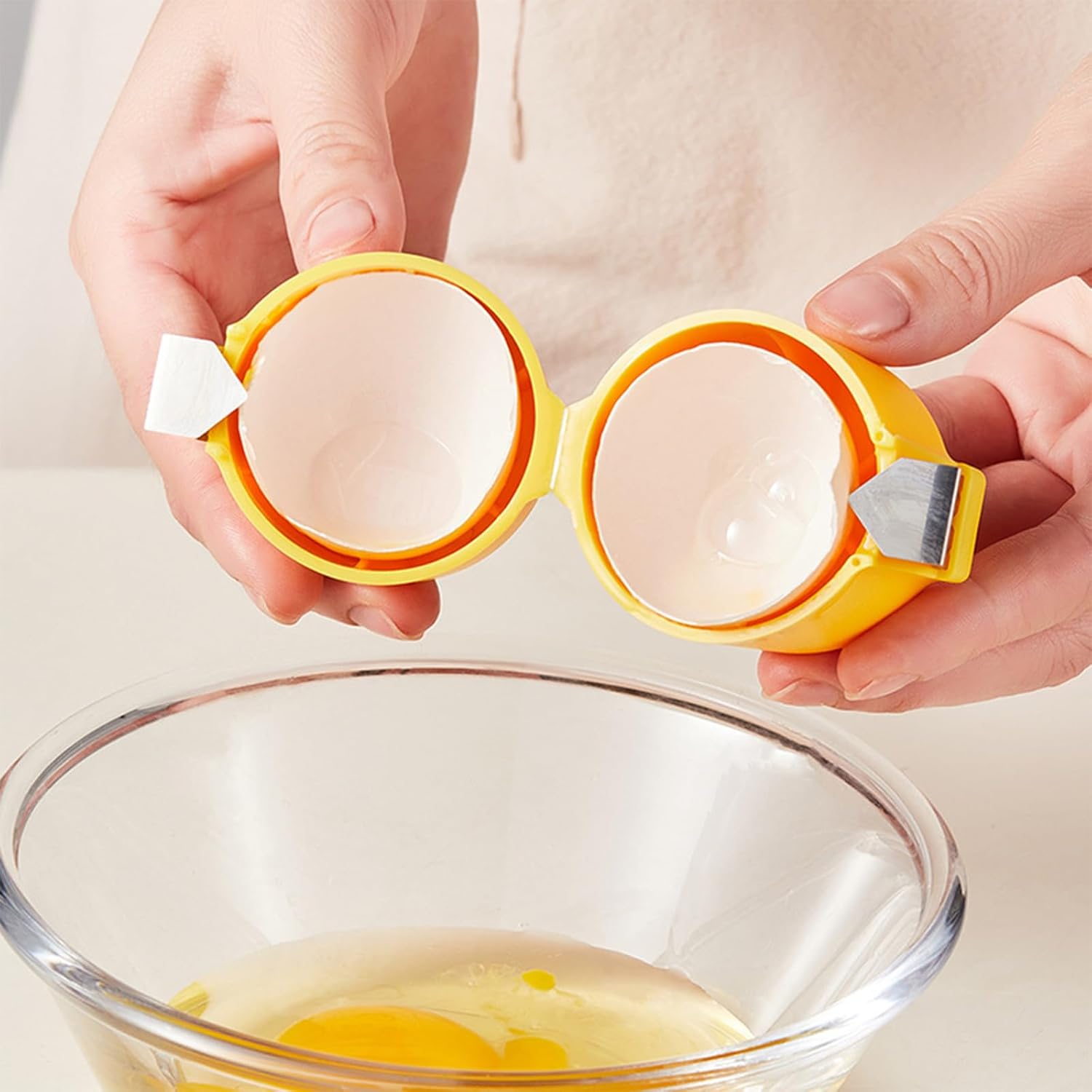 - Using the opener is simple and efficient. Just place the egg into the cube and press the metal clamp with your fingers. The stainless steel egg peeler cracks neatly inside, and with a quick flip, you can pour the intact yolk and egg white into a bowl or pan without mess